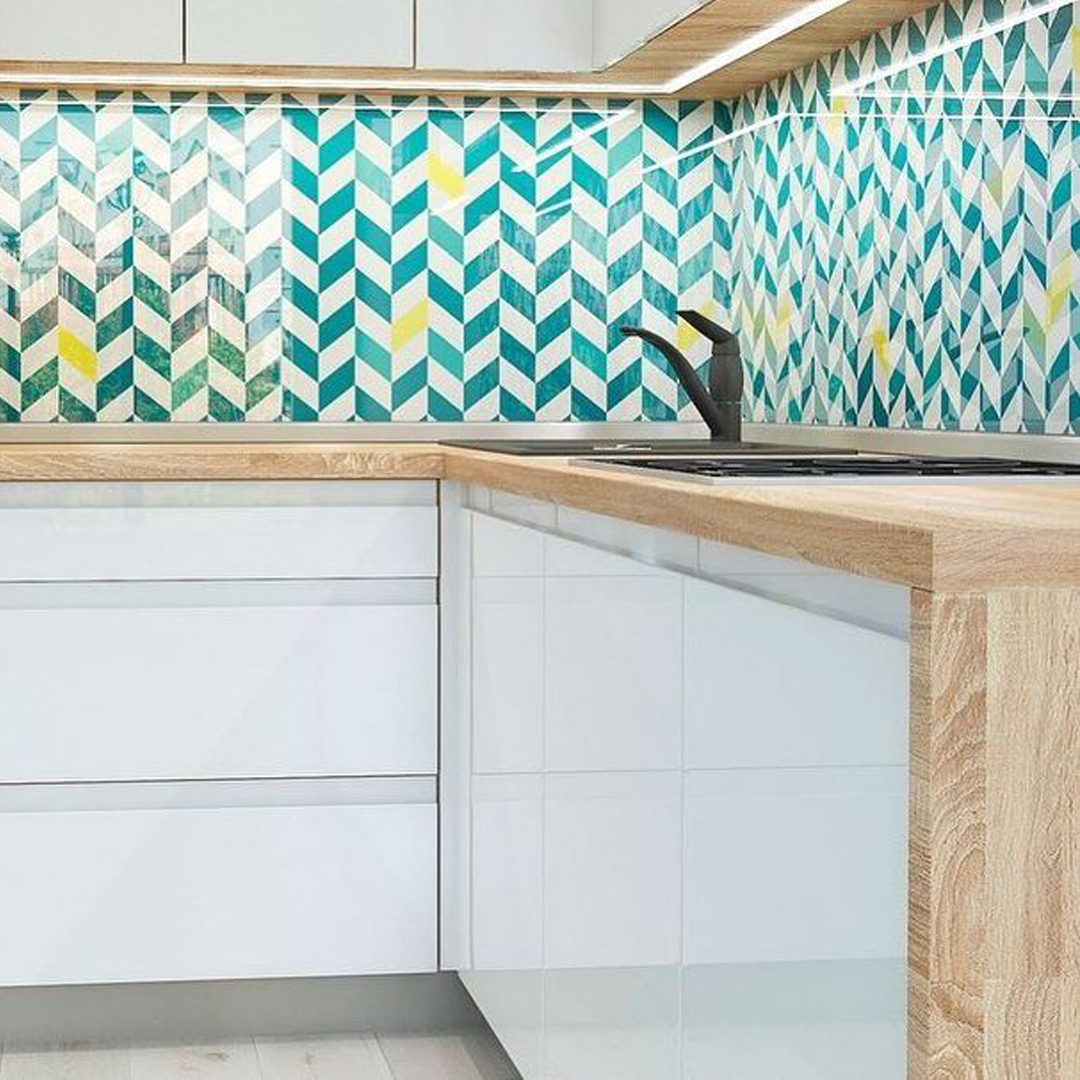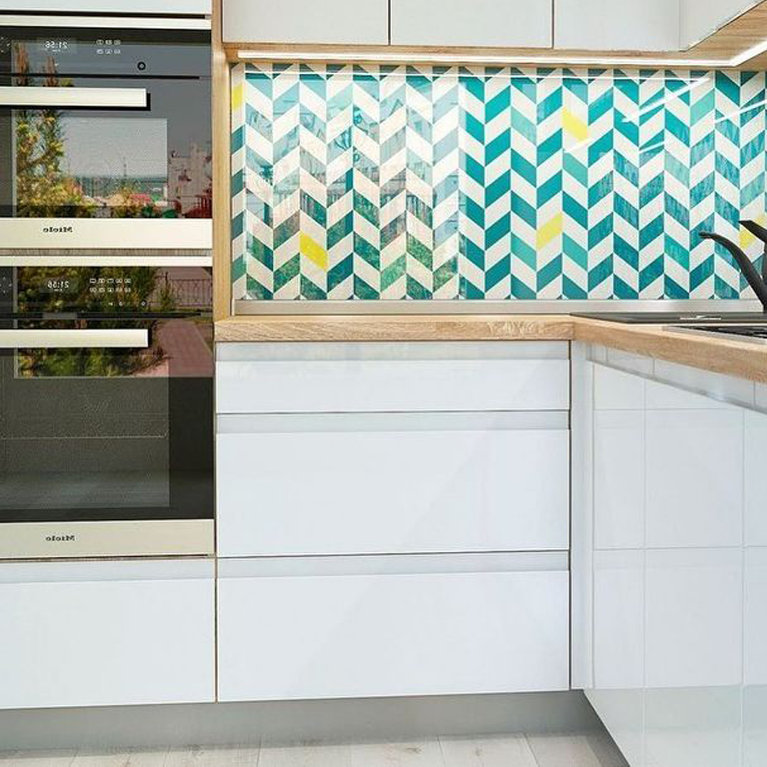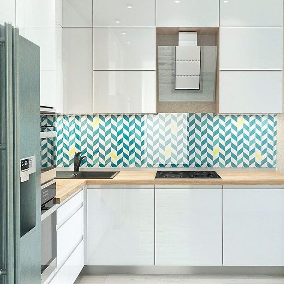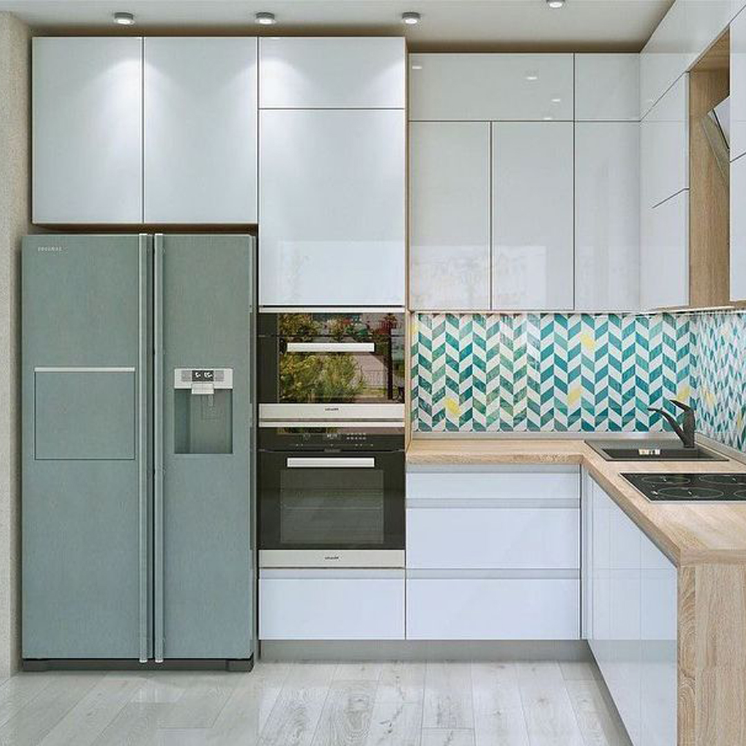 Глянцевые фасады бирюзового цвета.