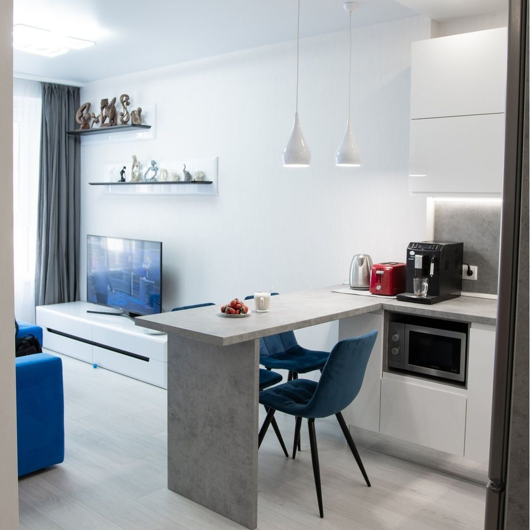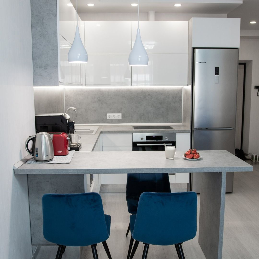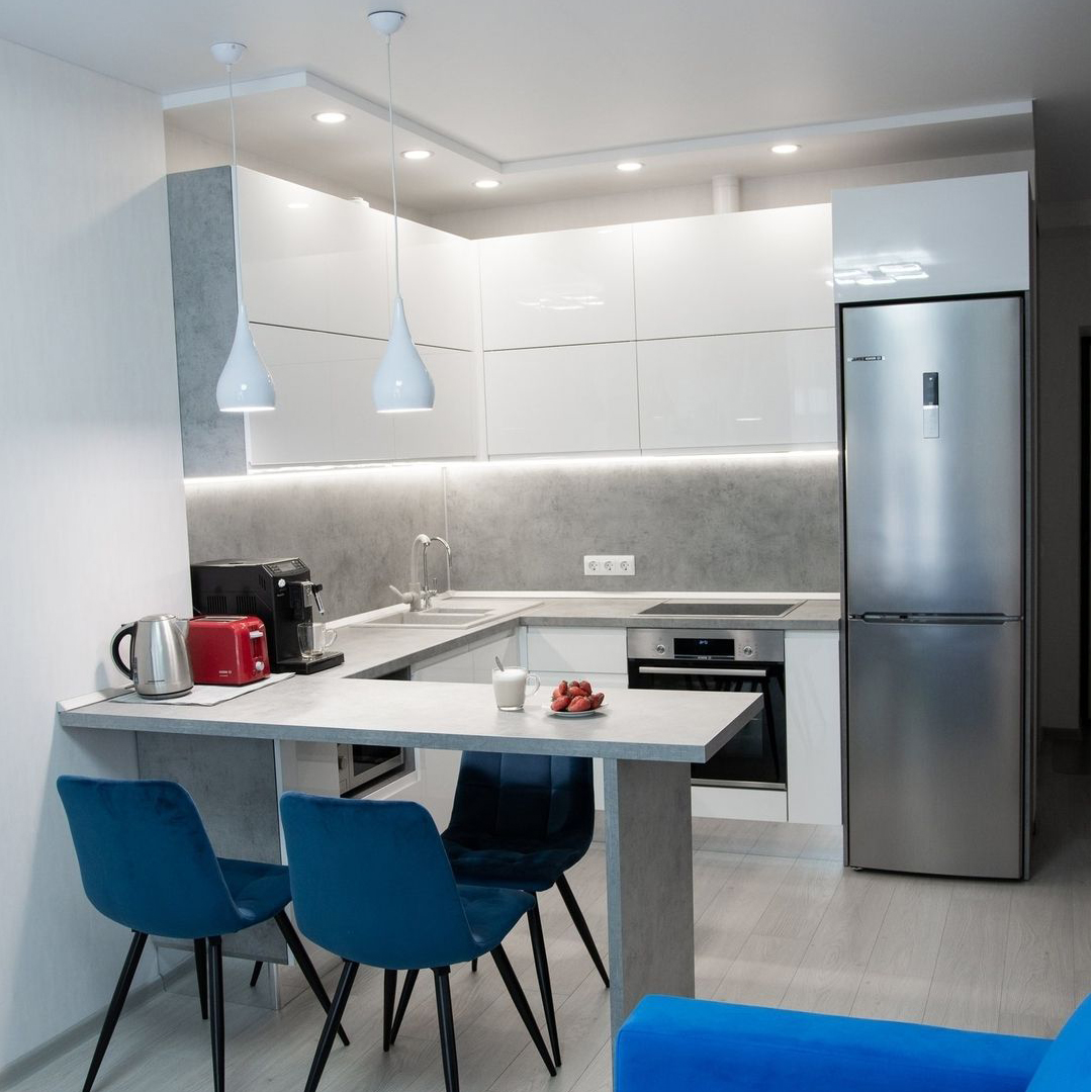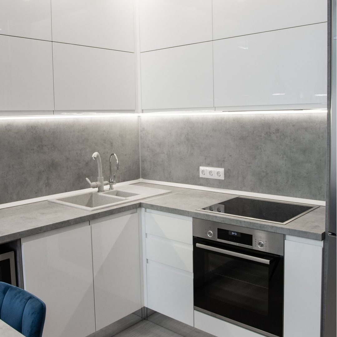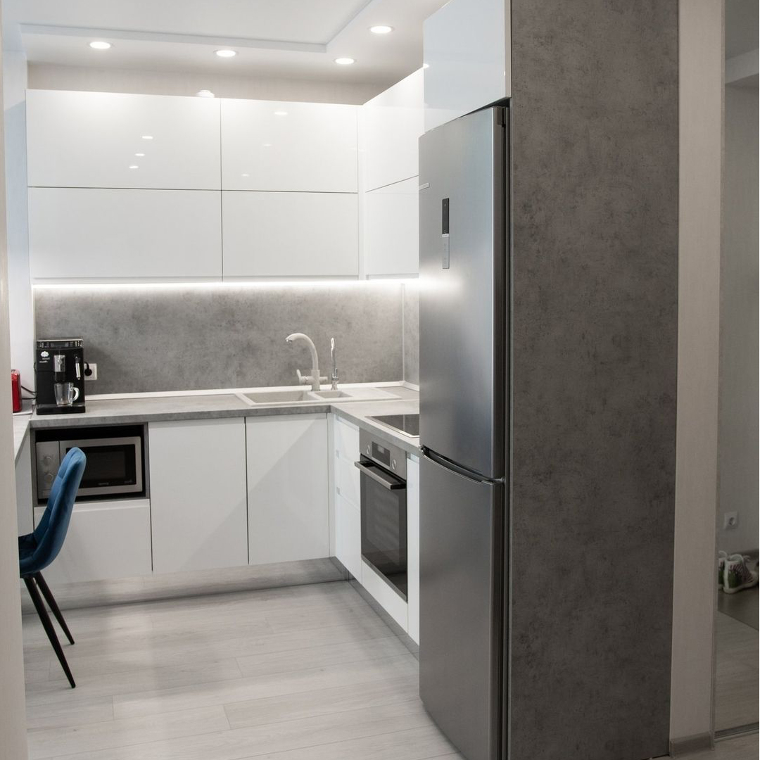 Компактная кухня в двухцветном исполнении. Фасады из ЛДСП.