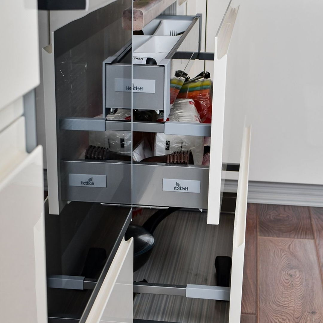 Множество шкафчиков и ящиков, удобная фурнитура, качественные материалы.