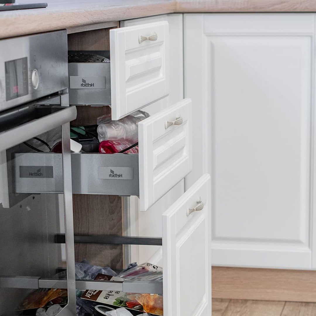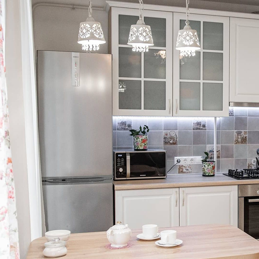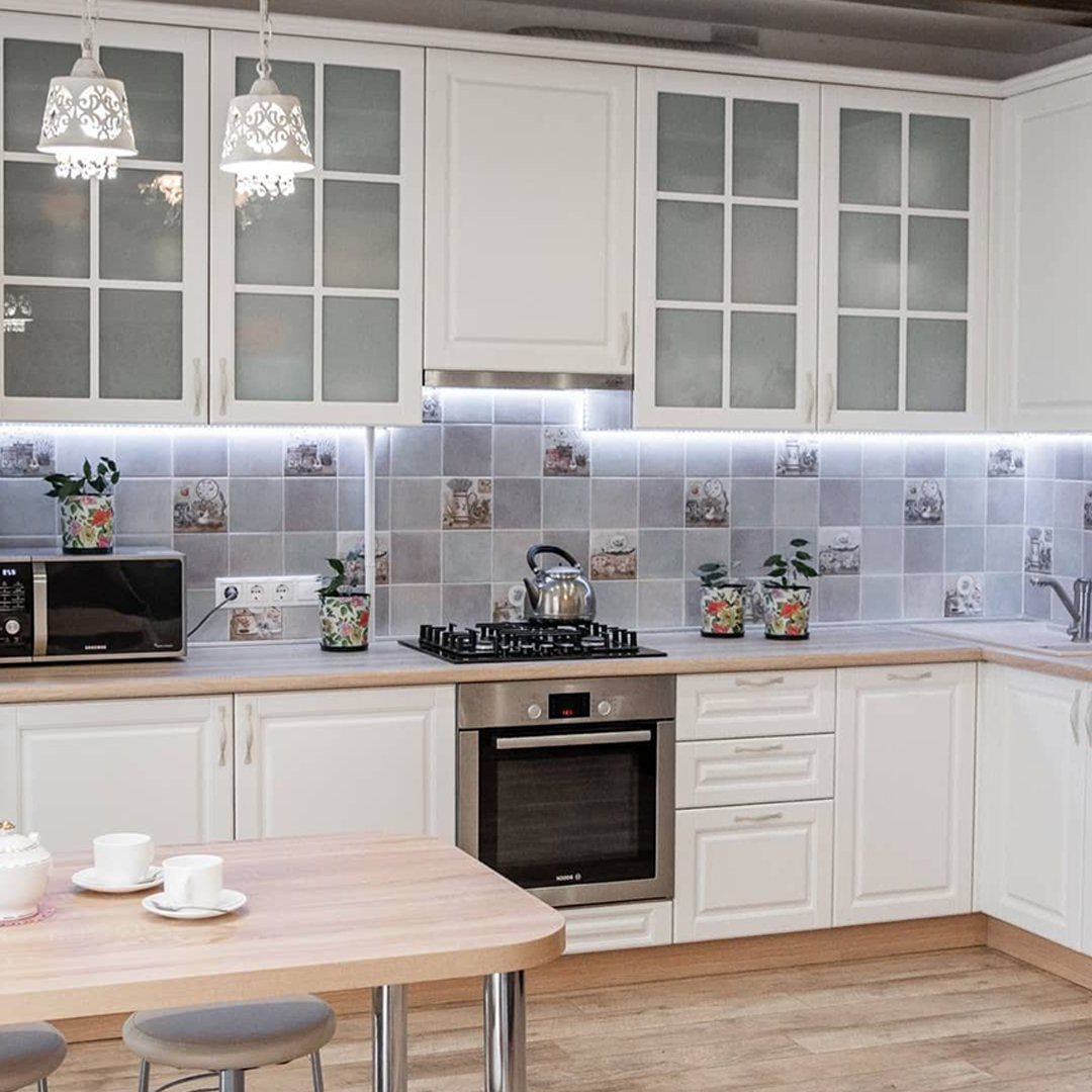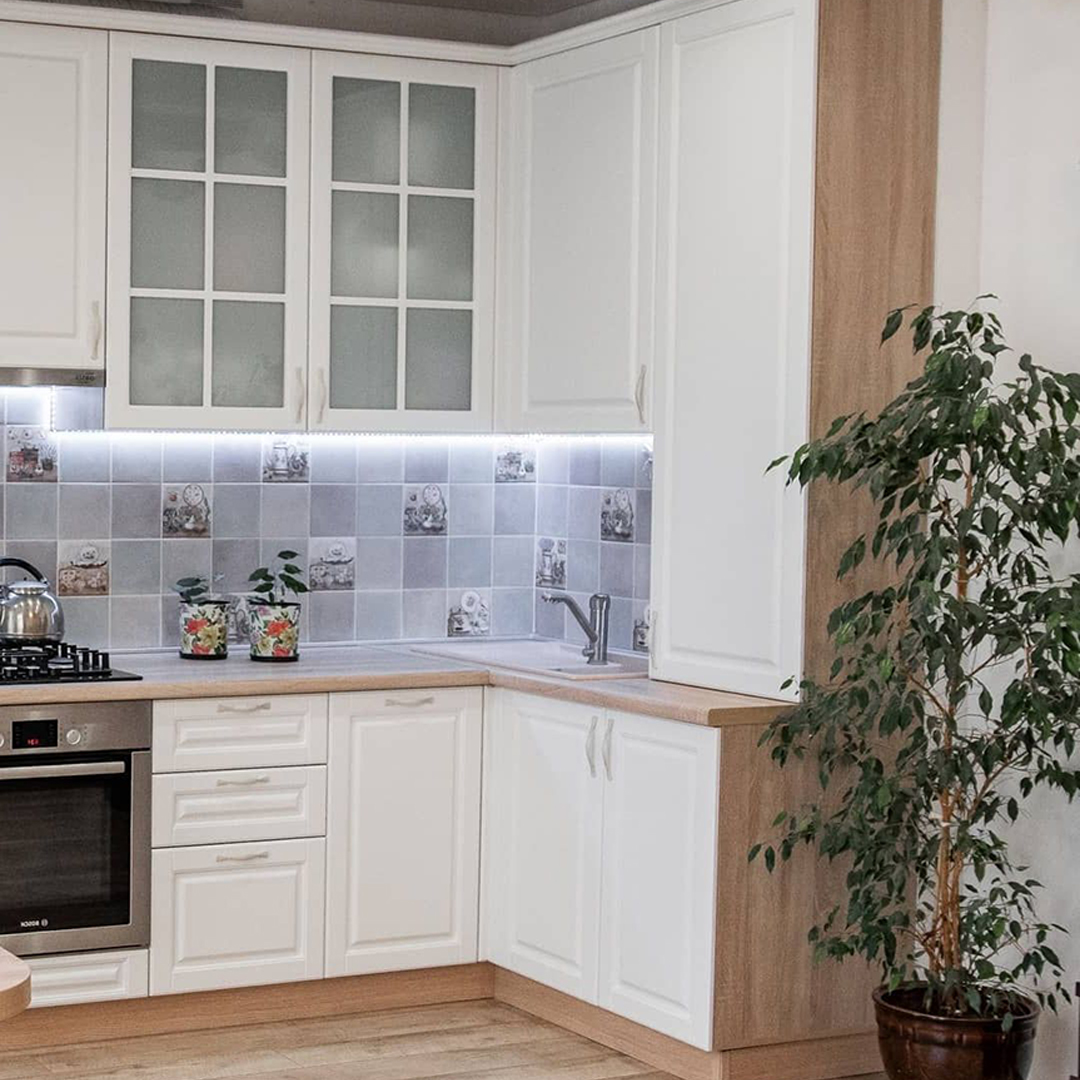 Современный кухонный гарнитур из крашенного МДФ. Вместительные шкафчики.