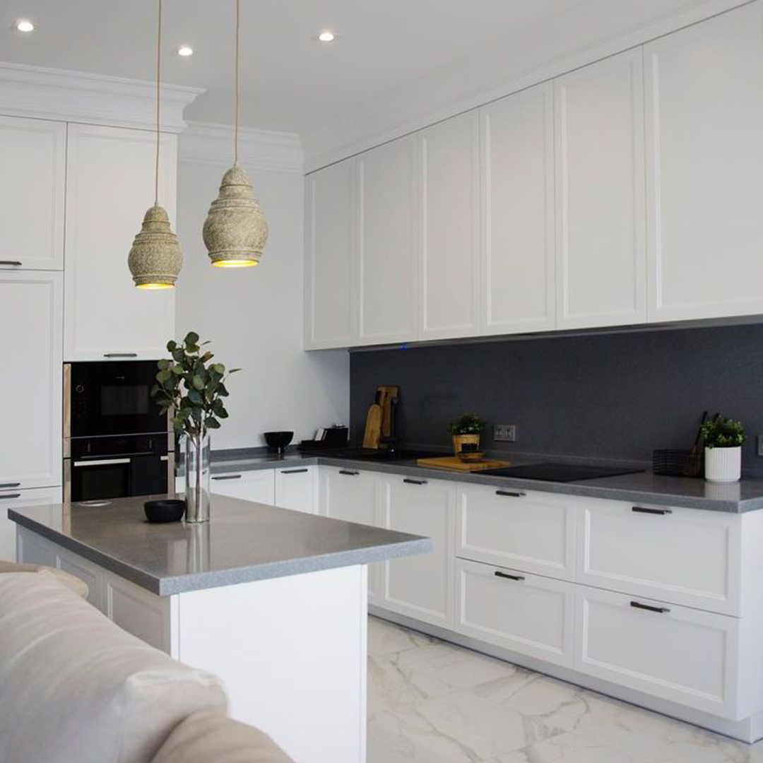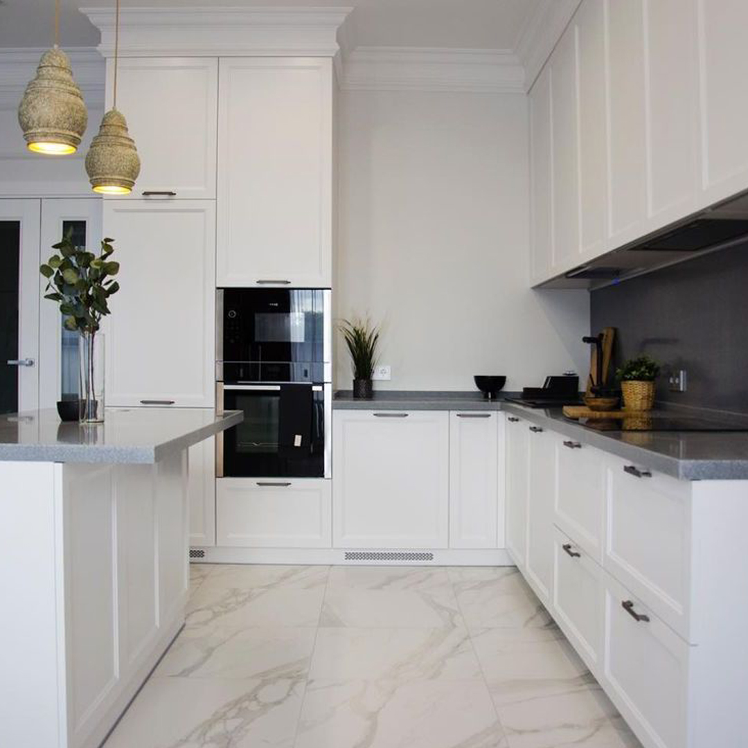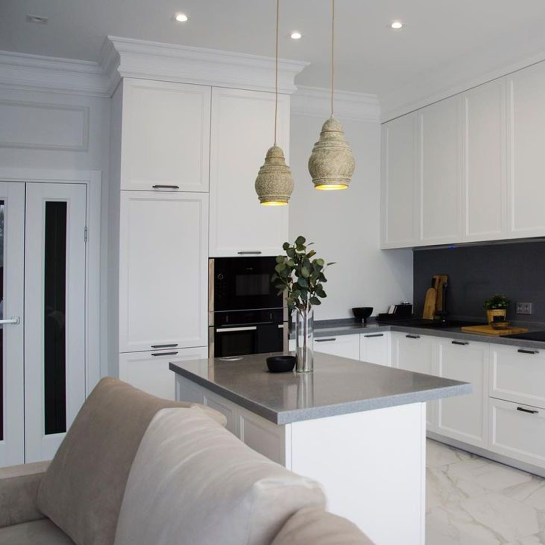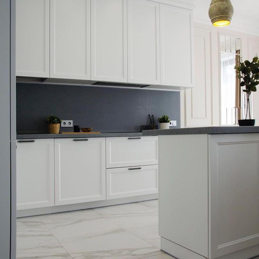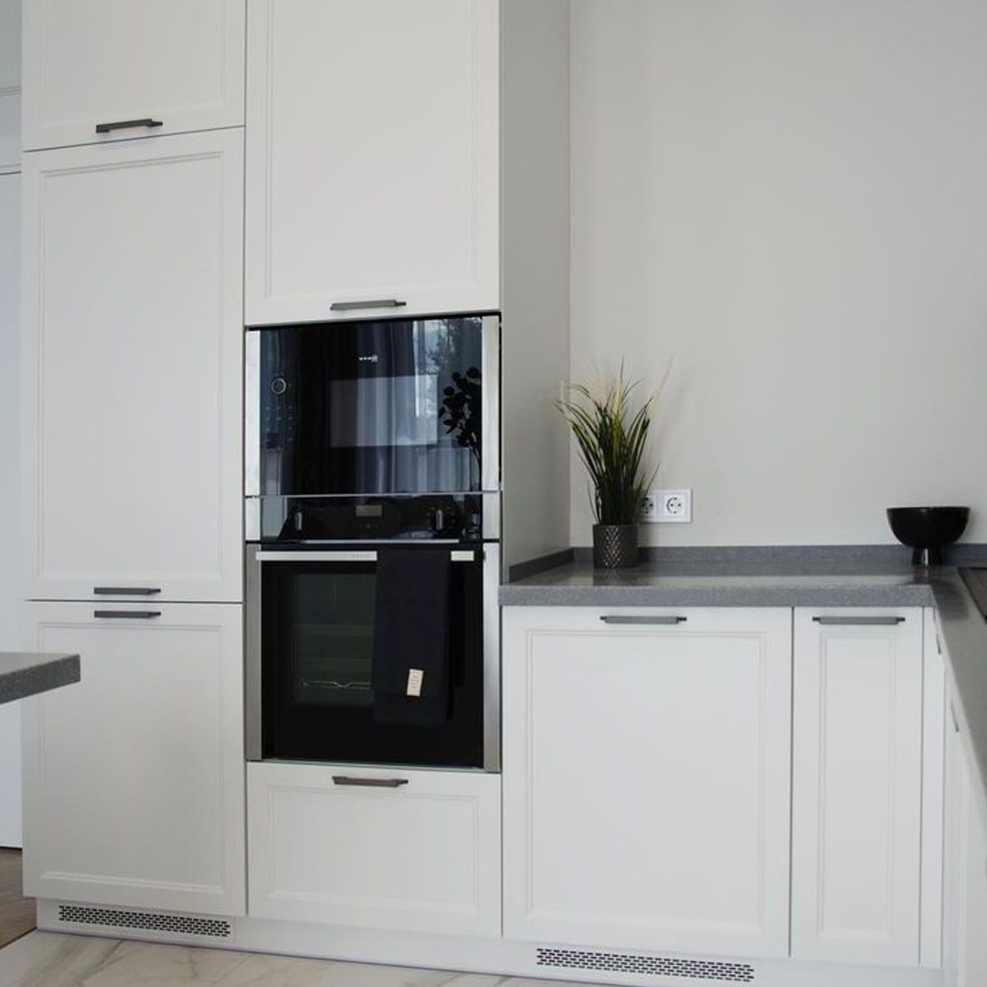 Белые фасады с фрезеровкой. Ширина кухни 200 см.