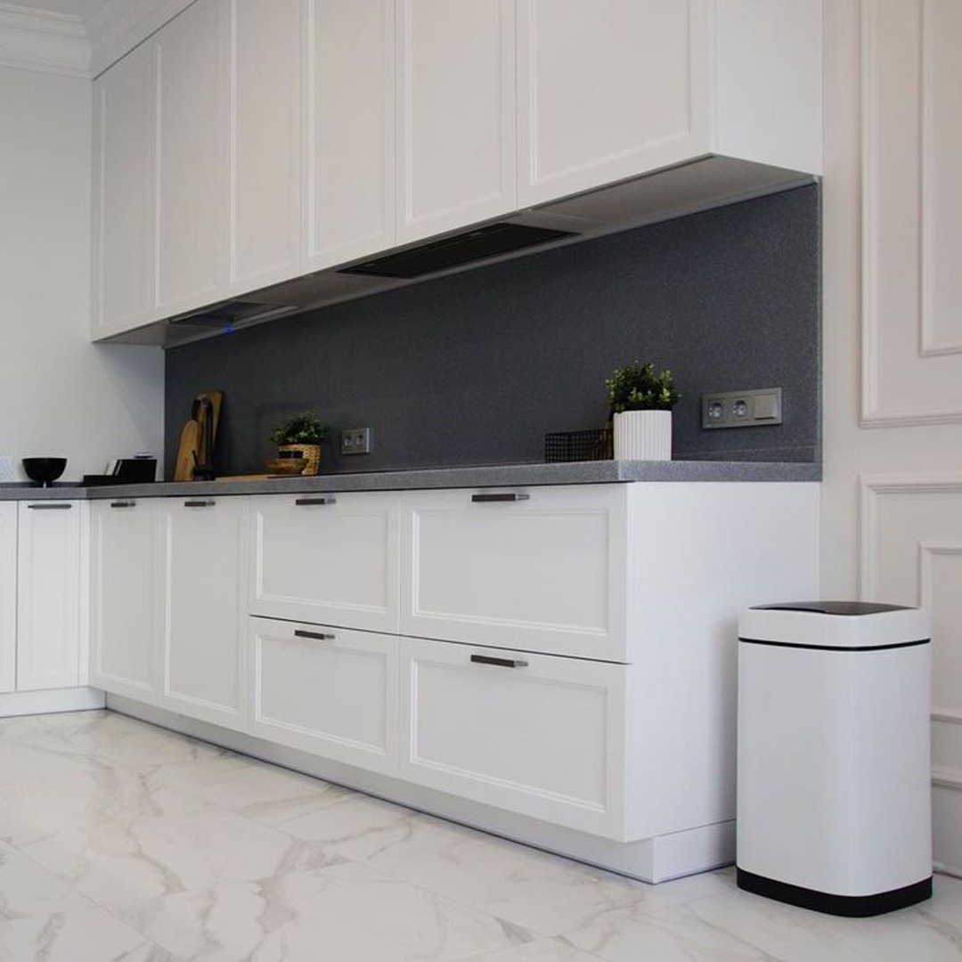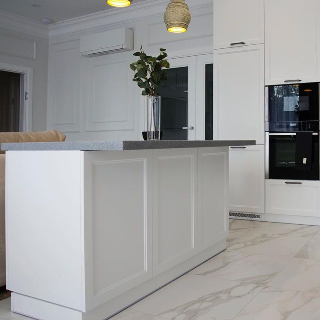 Линейный гарнитур в неоклассическом стиле из крашеной плиты МДФ.
