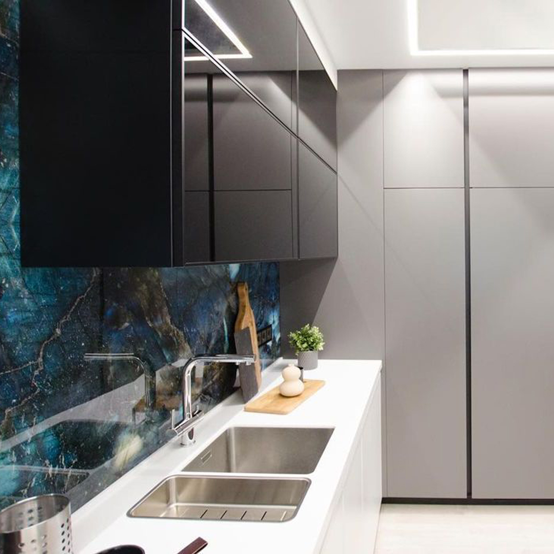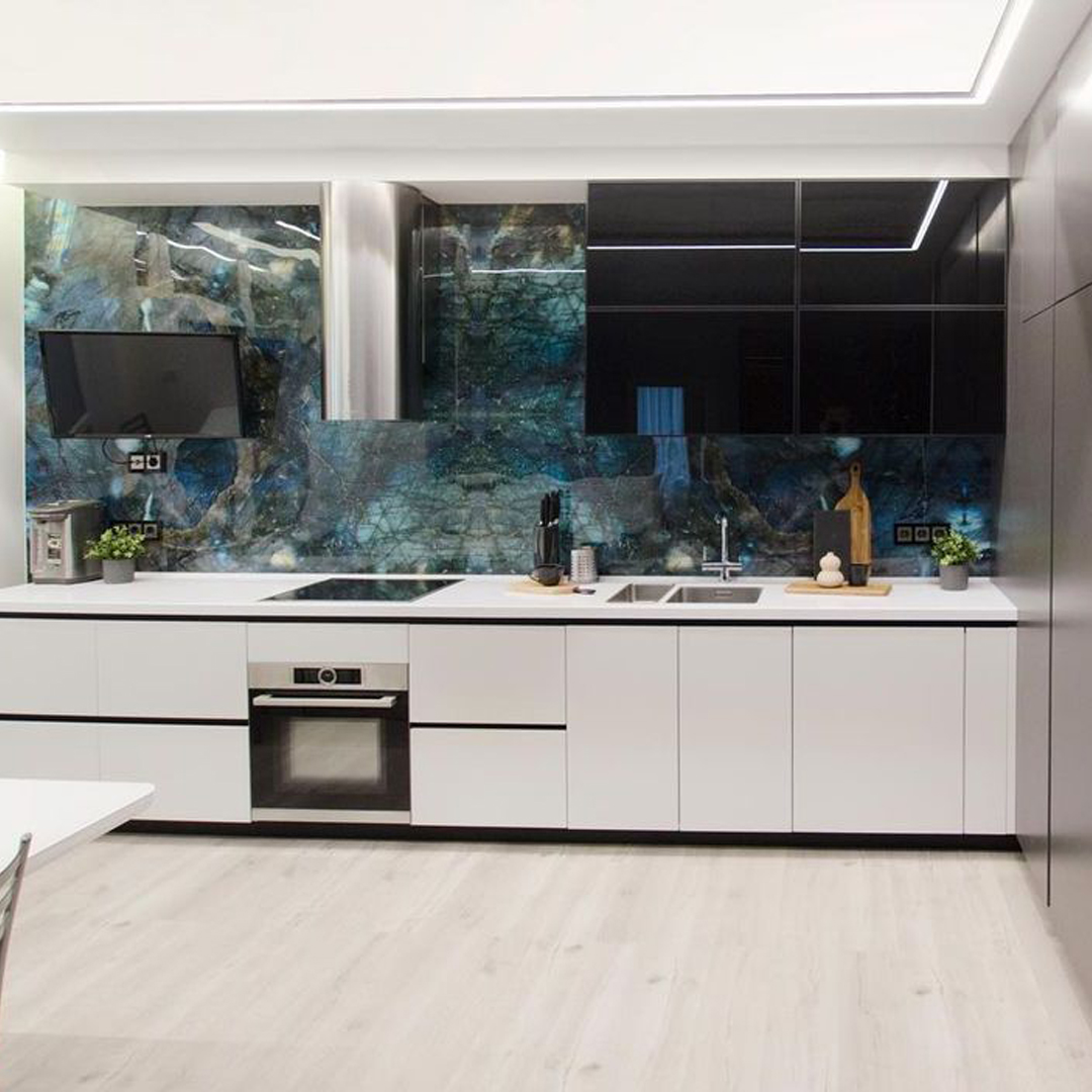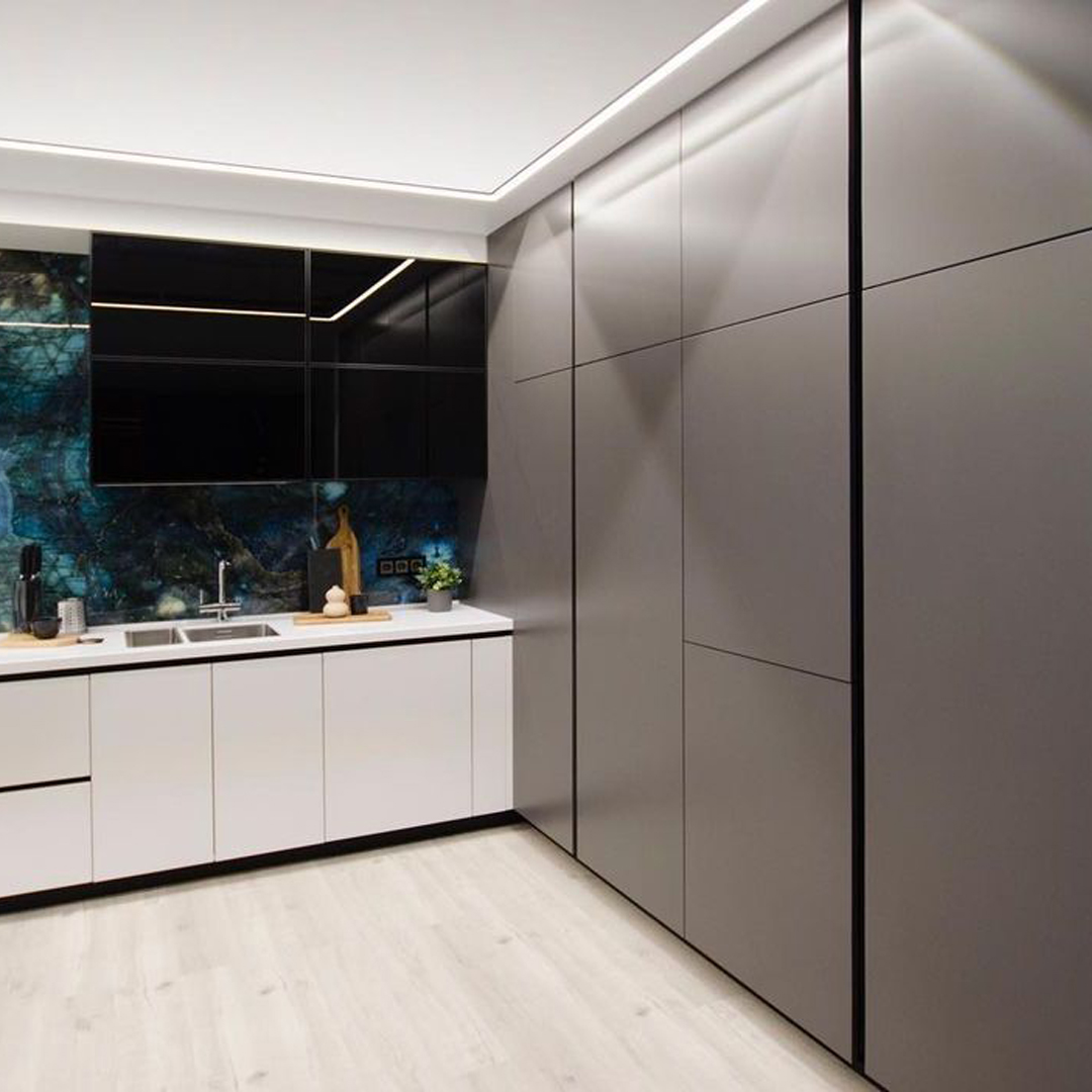 Современная линейная кухня. Разные цветовые решения фасадов и столешницы.