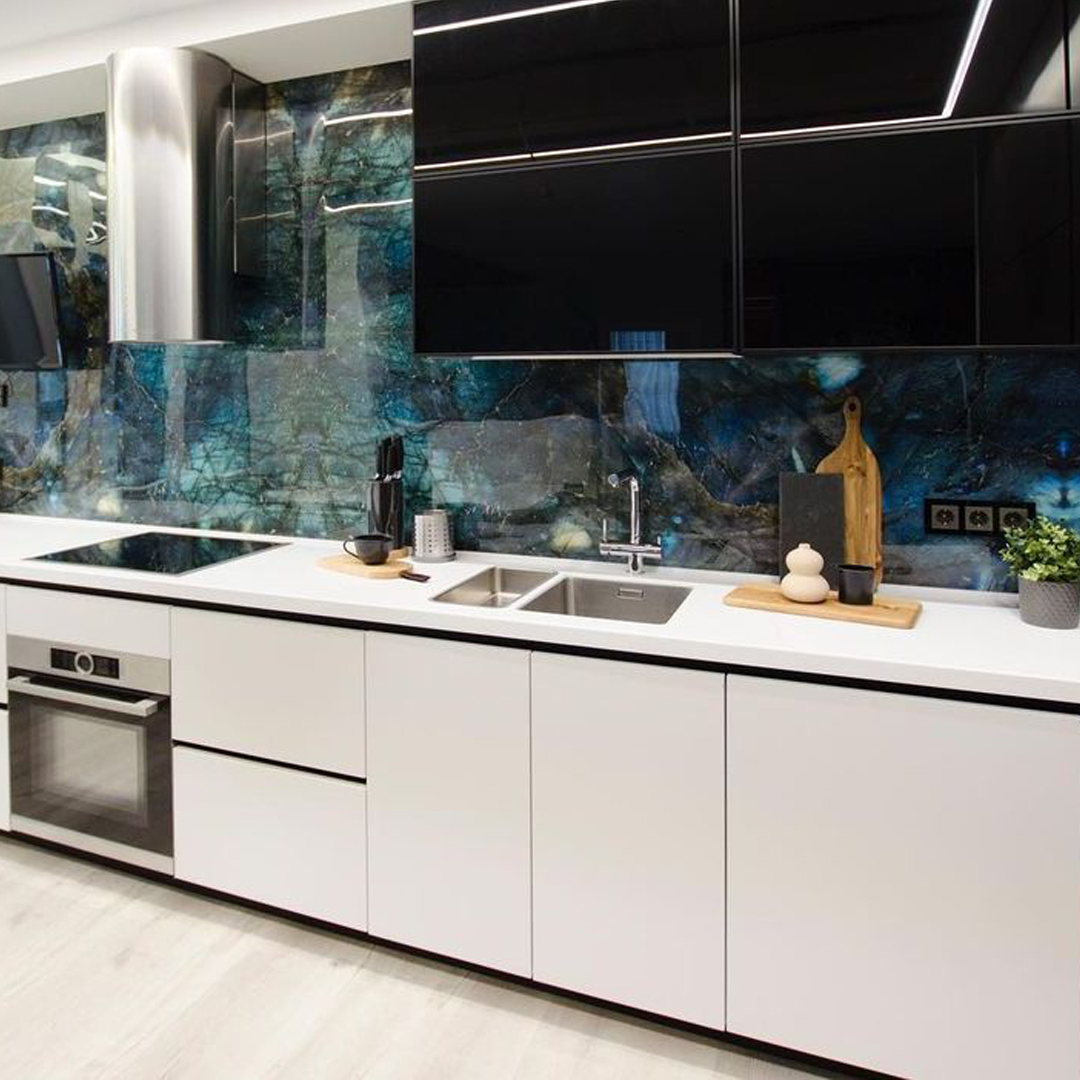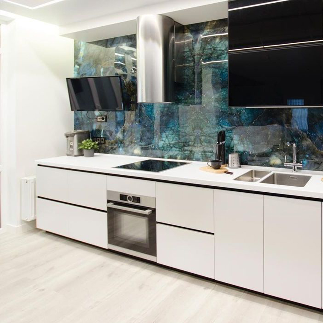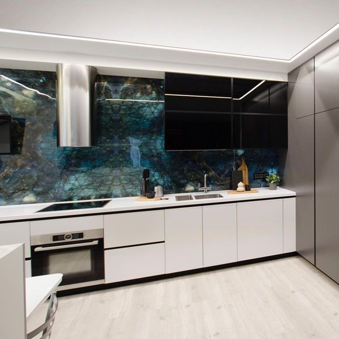 Современная линейная кухня. Разные цветовые решения фасадов и столешницы.