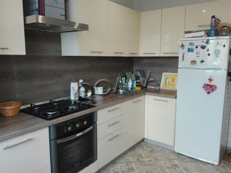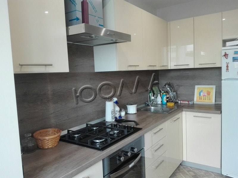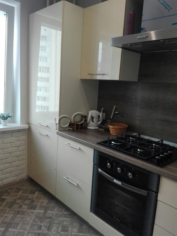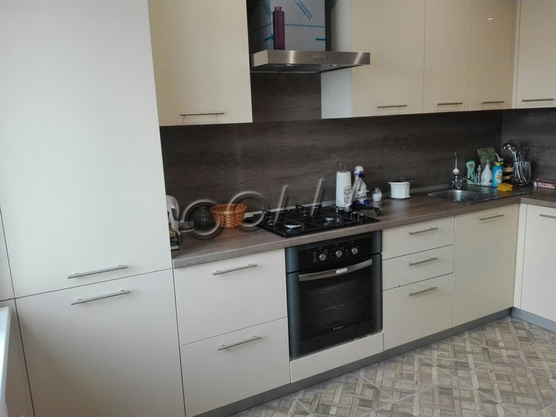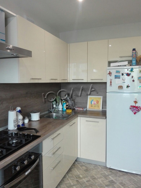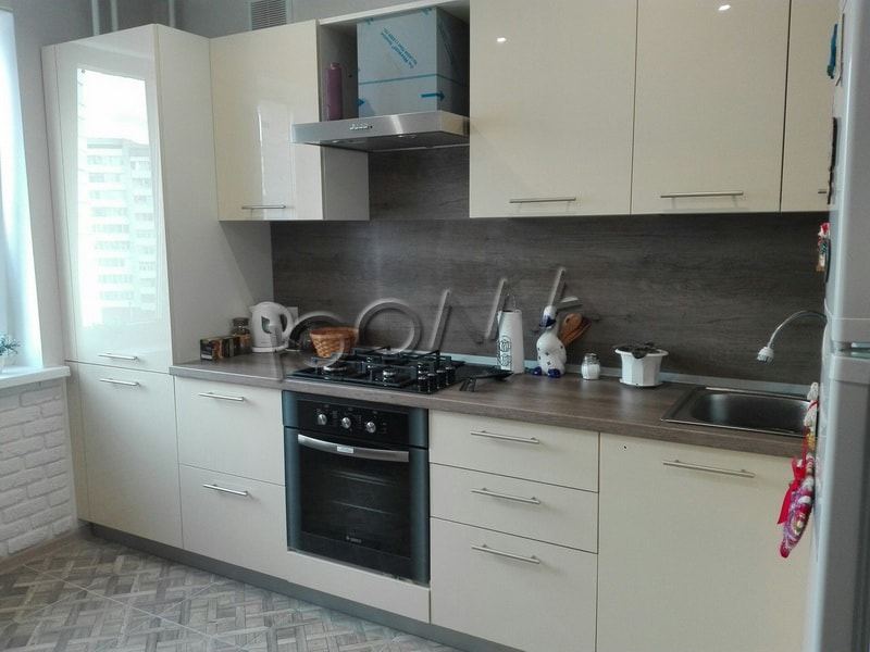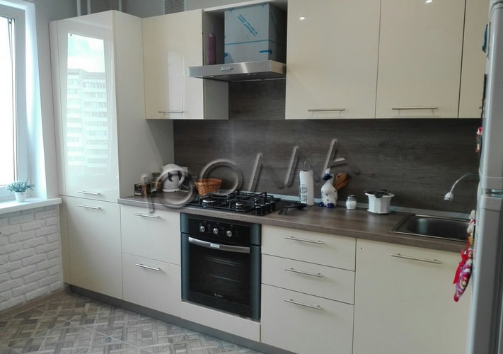 Столешница под темное дерево в теплых тонах отлично гармонирует с глянцевыми фасадами легкого бисквитного оттенка, ручки-рейлинги под латунь. В данном угловом кухонном гарнитуре ничего лишнего, каждая деталь имеет особое функциональное назначение - в этом весь строгий и практичный минимализм.