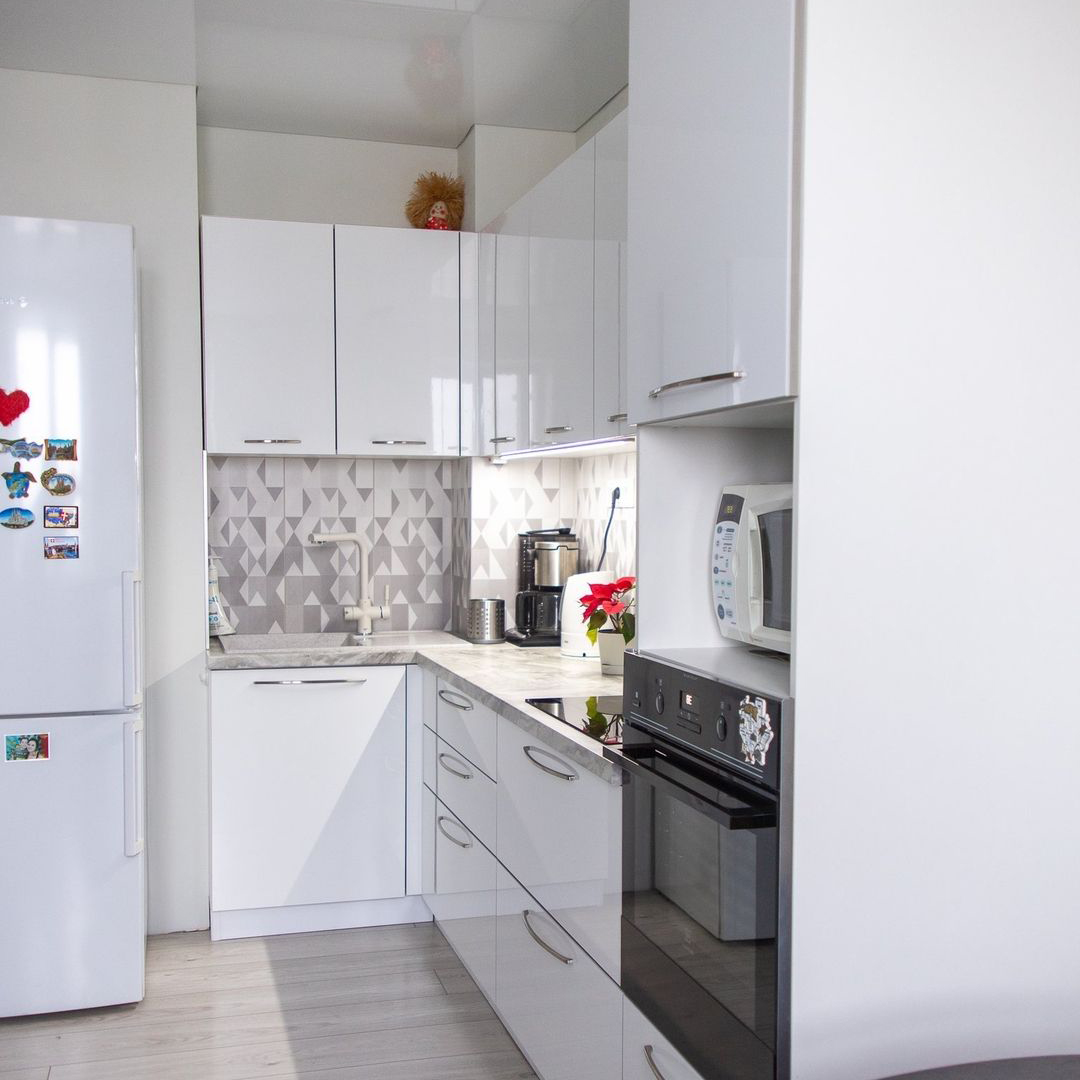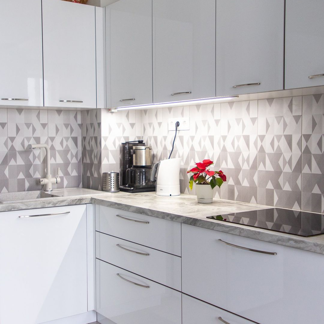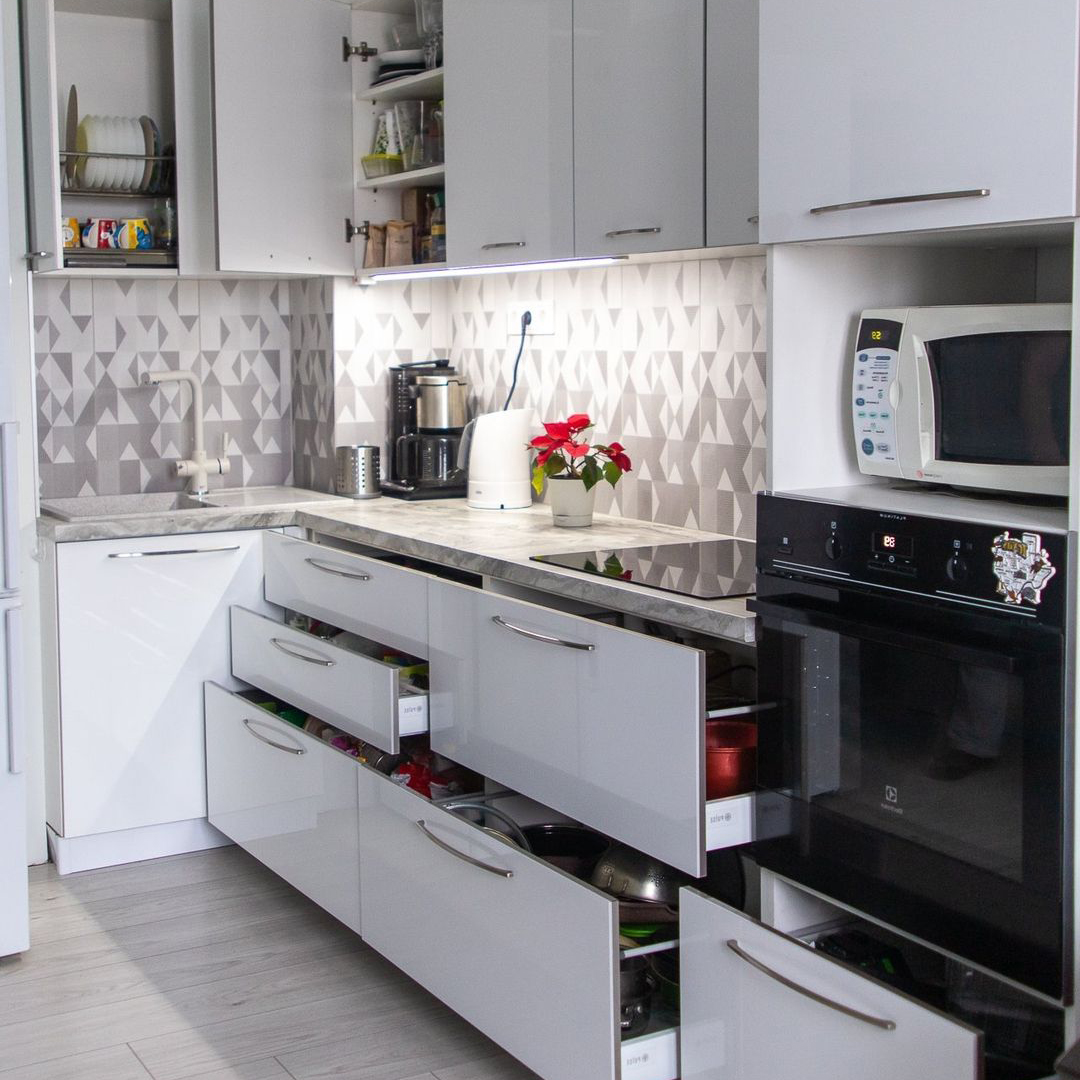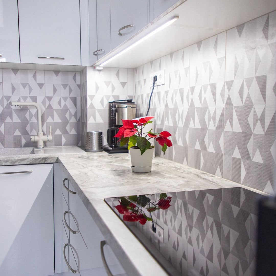Современный кухонный гарнитур из ДСП в скандинавском стиле.