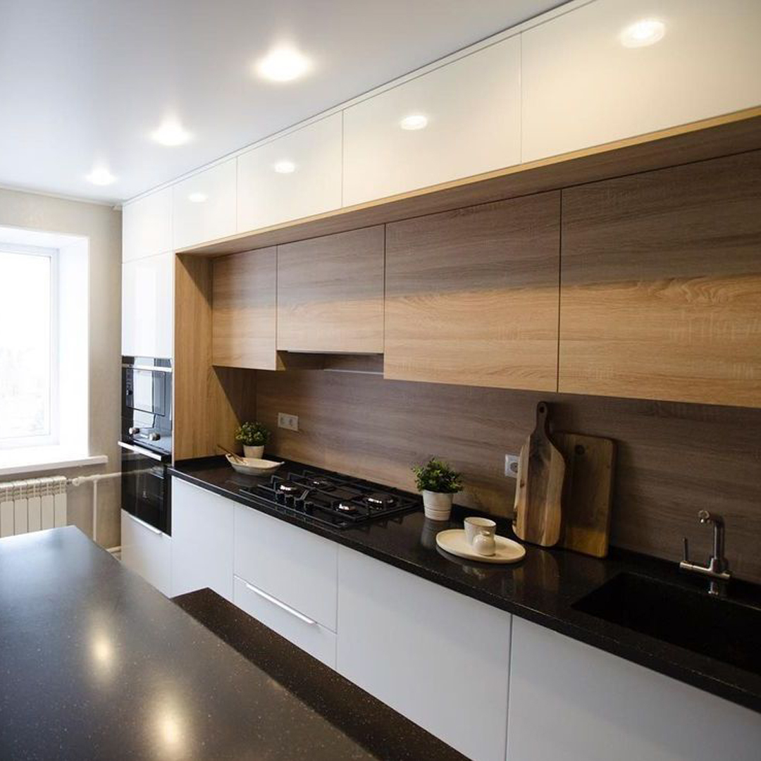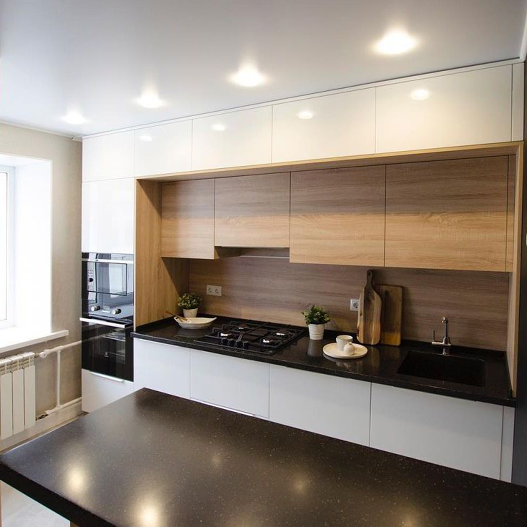 Современная линейная кухня с вместительными шкафчиками. Качественные материалы.