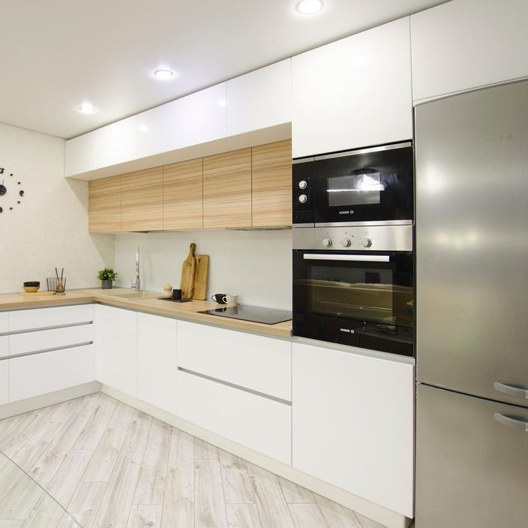 Удобные металлические ручки в цвете «сатин». Ширина кухни 190 см.