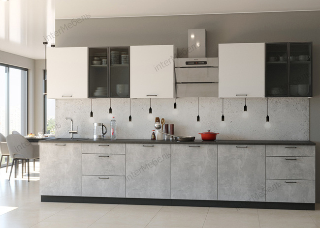 Кухня модульная с витриной в цвете "графит". Ширина гарнитура – 3 метра.