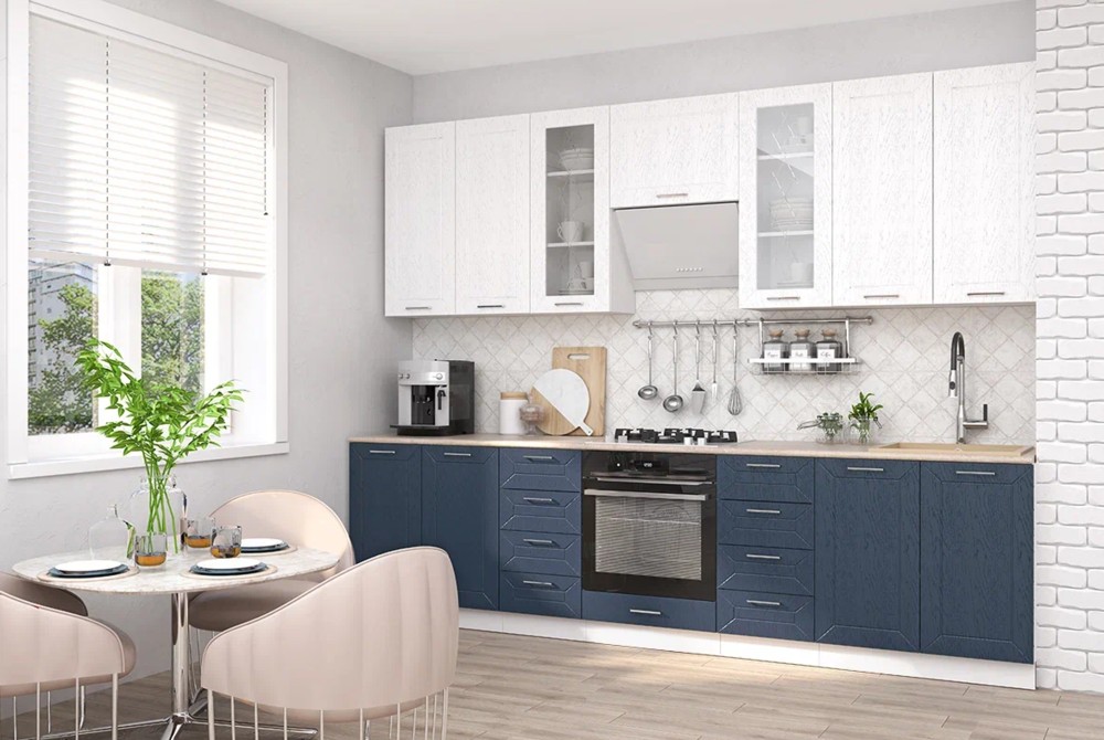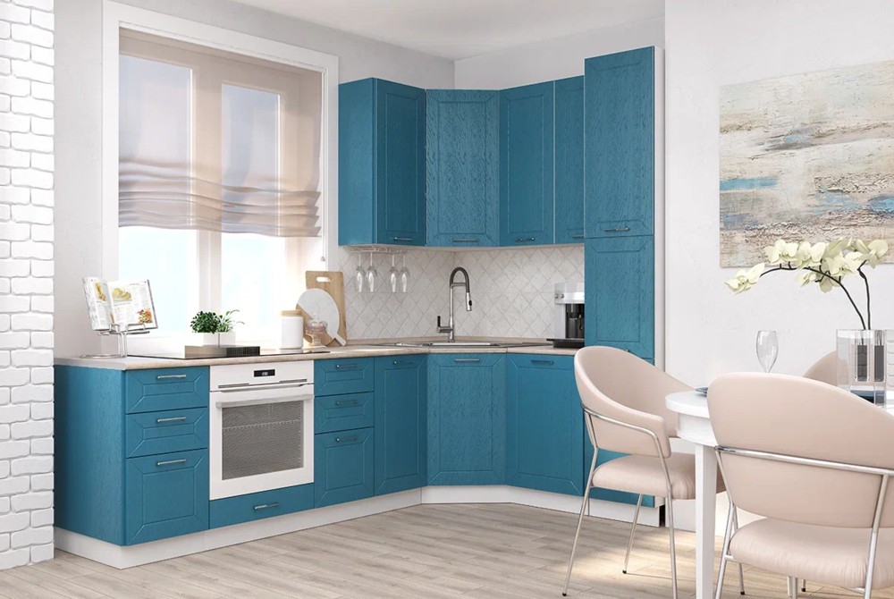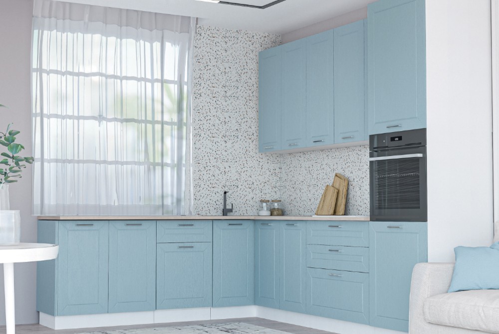 Цена указана за кухню шириной 2,7 метра. Цвет фасадов: голубой.