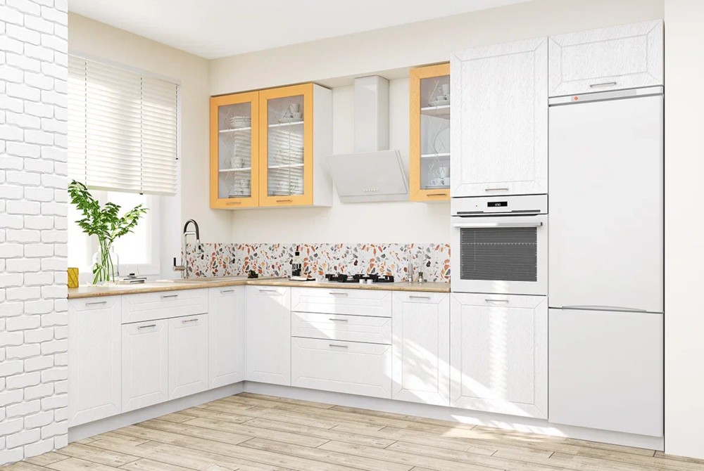 Однотонный древесный цвет фасадов из ЛДСП. Ширина кухни 140 см.