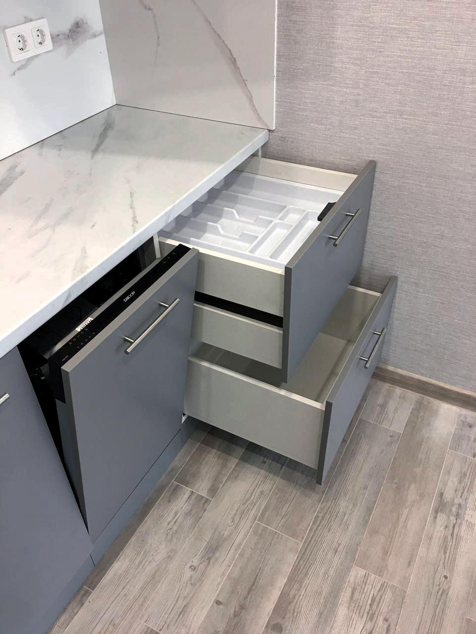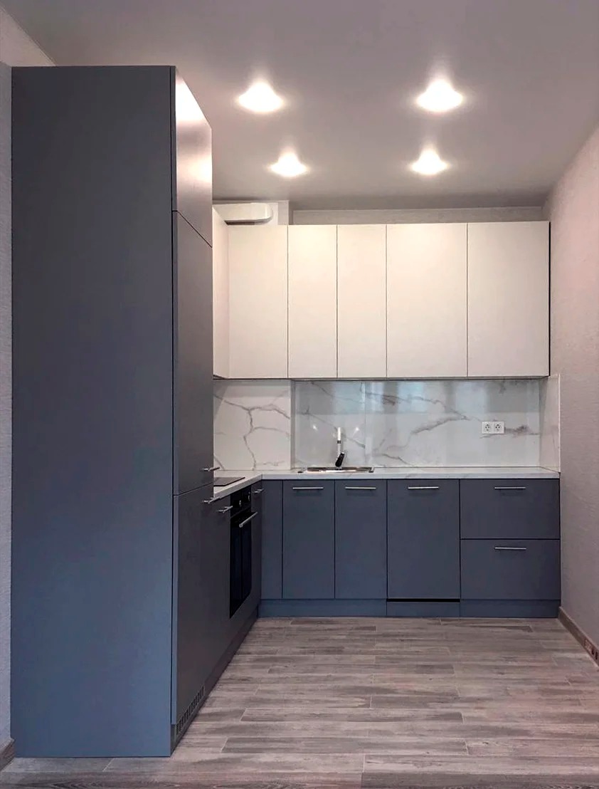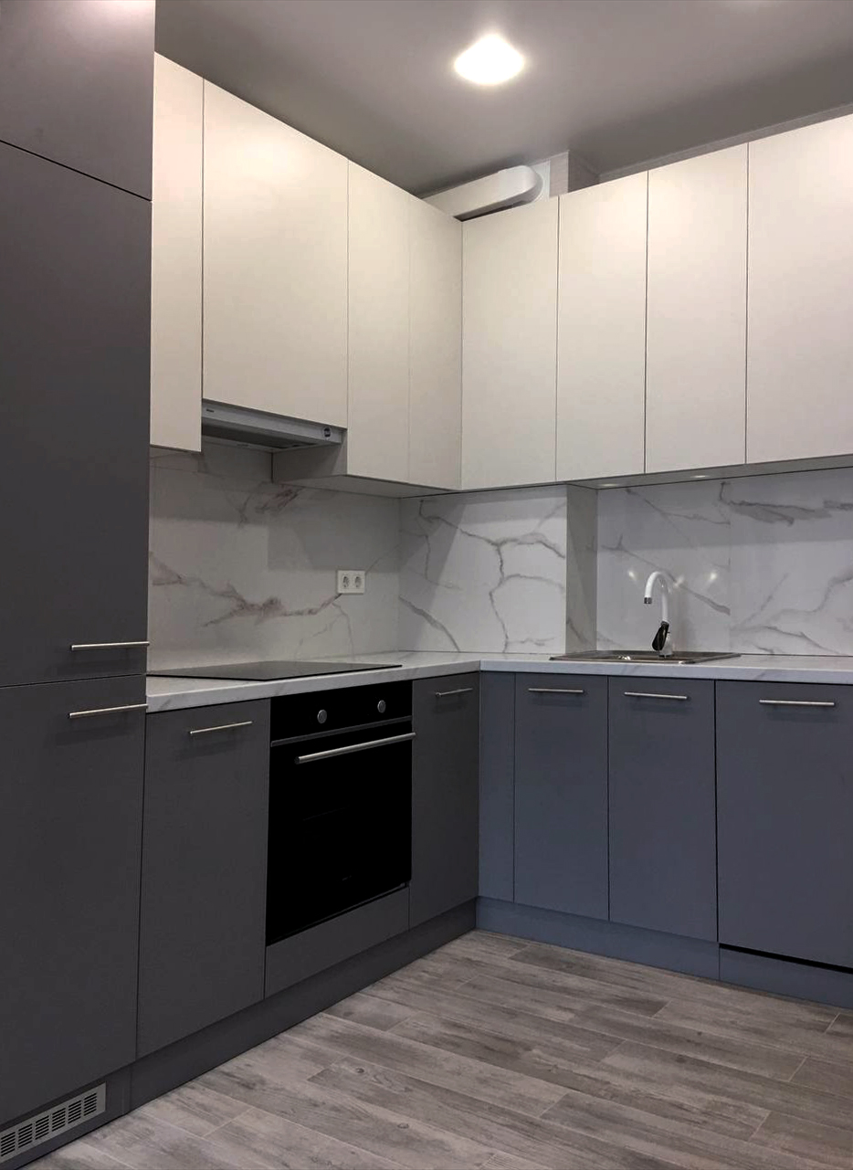 Угловая кухня под окно с серыми матовыми фасадами