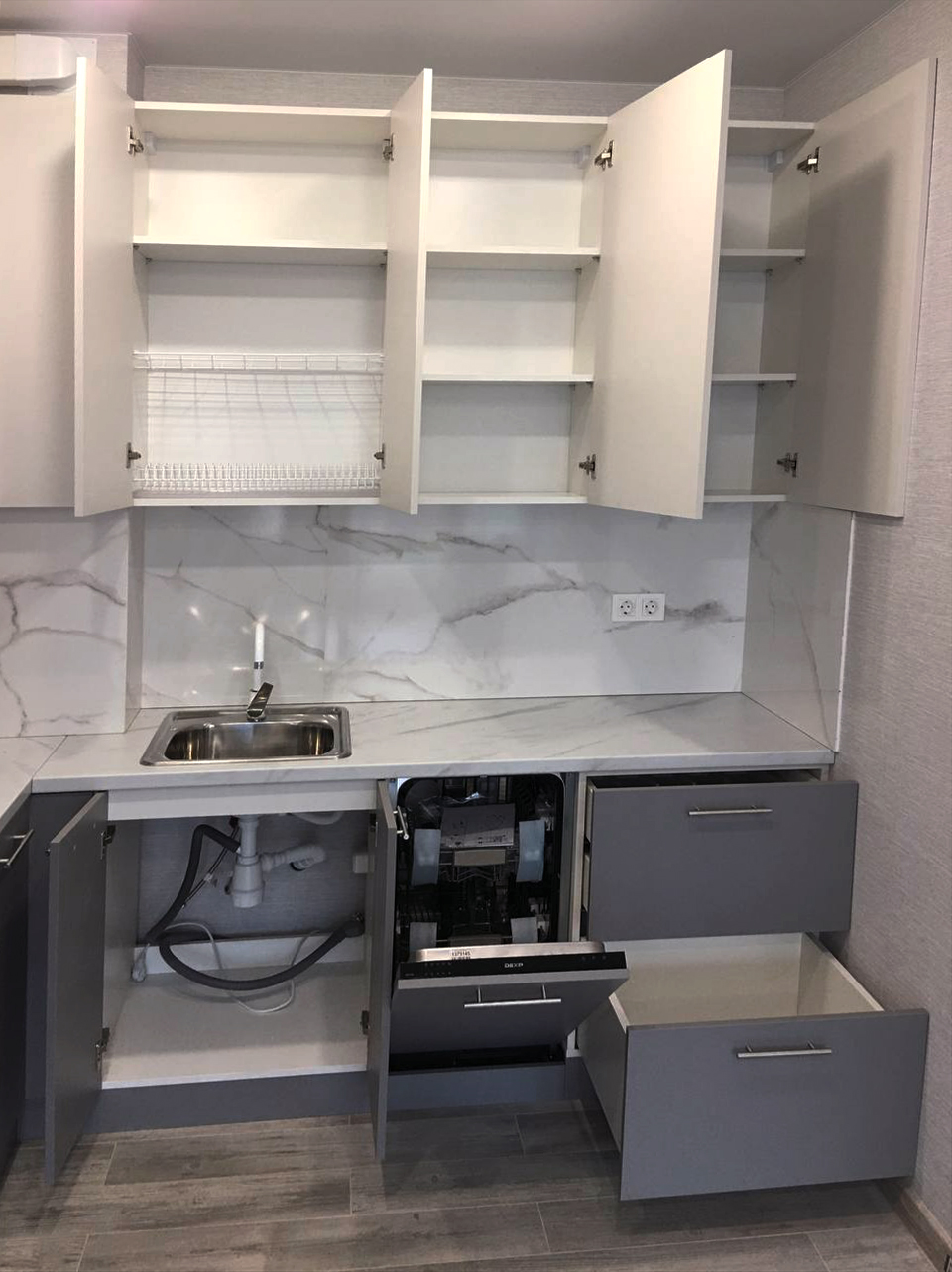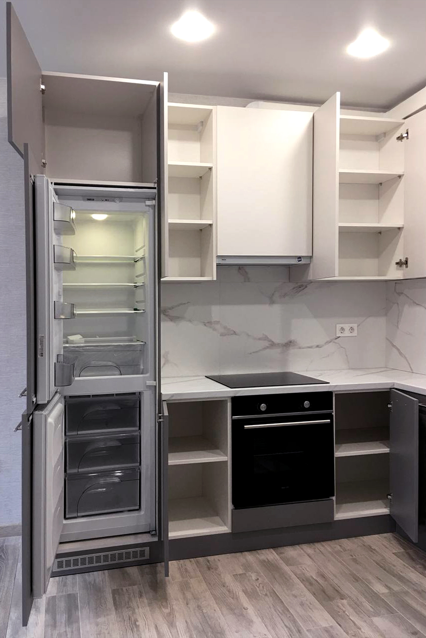 Кухонный гарнитур с модульными шкафами и открытыми полками.