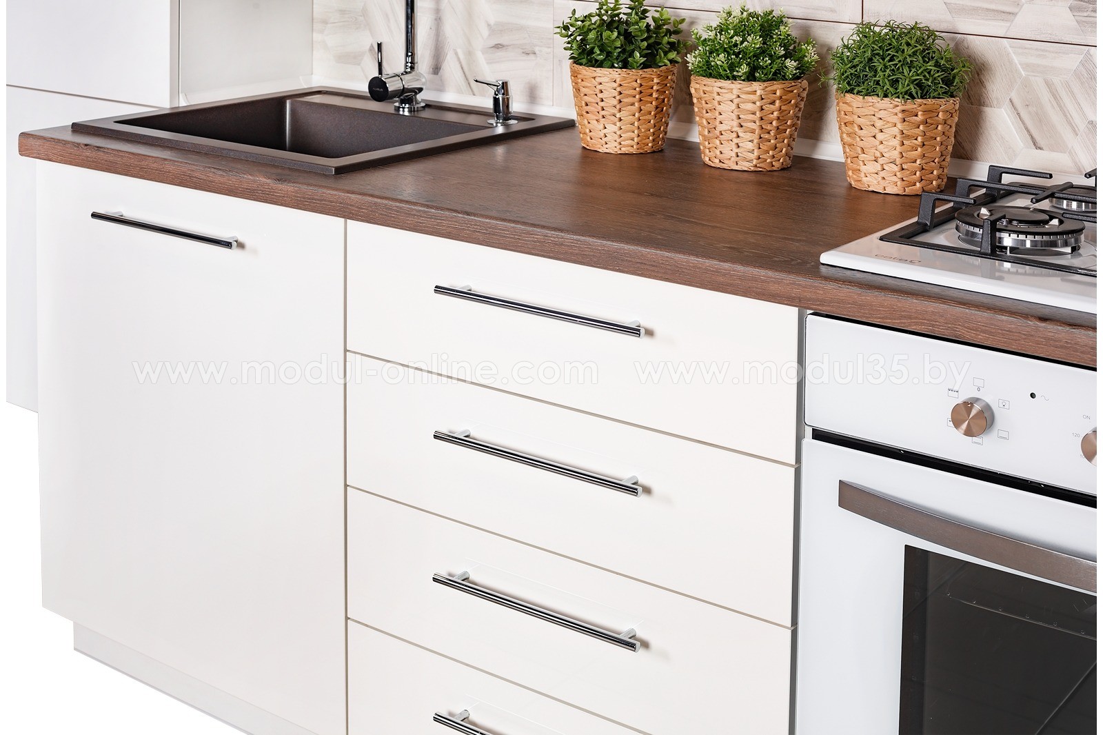 - Комплект поставки. Нижние и верхние кухонные модули, фасады (каждый в отдельной упаковке), цоколь, защитный профиль, столешница, пристенный плинтус + заглушки, сушка, ручки, соединительные планки.