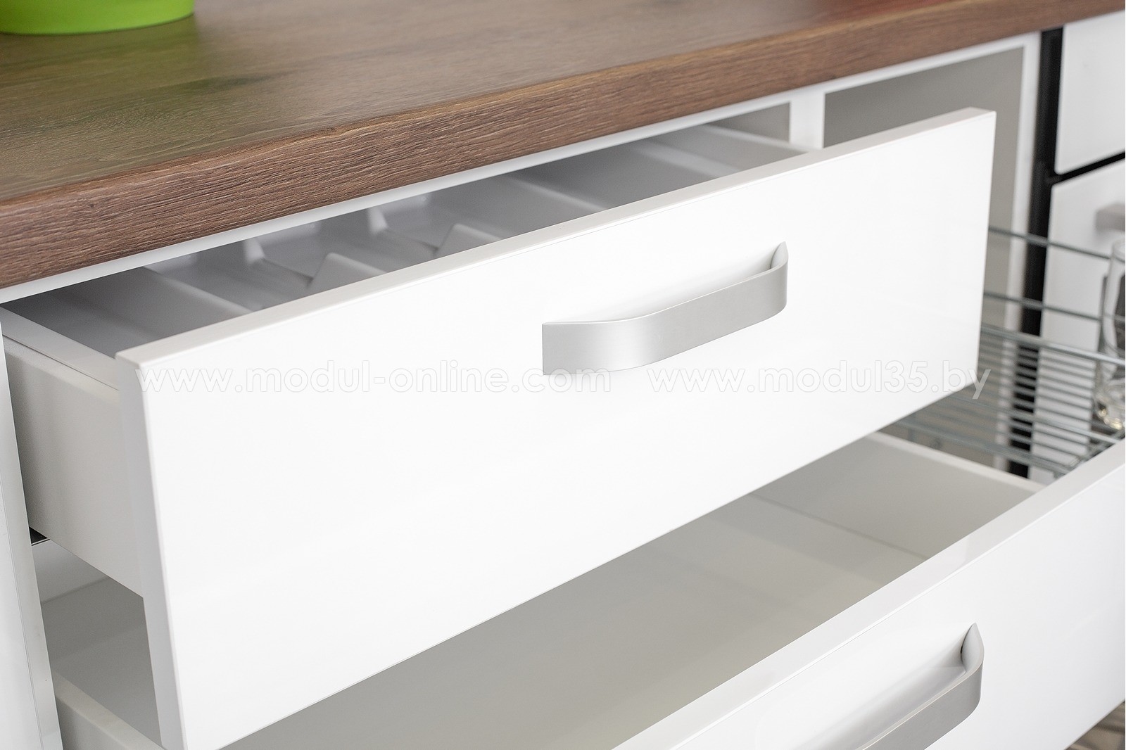 - Комплект поставки. Нижние и верхние кухонные модули, фасады (каждый в отдельной упаковке), цоколь, защитный профиль, столешница, пристенный плинтус + заглушки, сушка, ручки, соединительные планки.