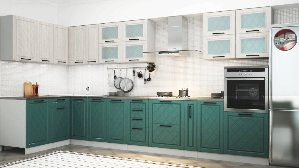 Сочетание черного, цвета небесной лазури и дерева. Фурнитура: Blum (Австрия).