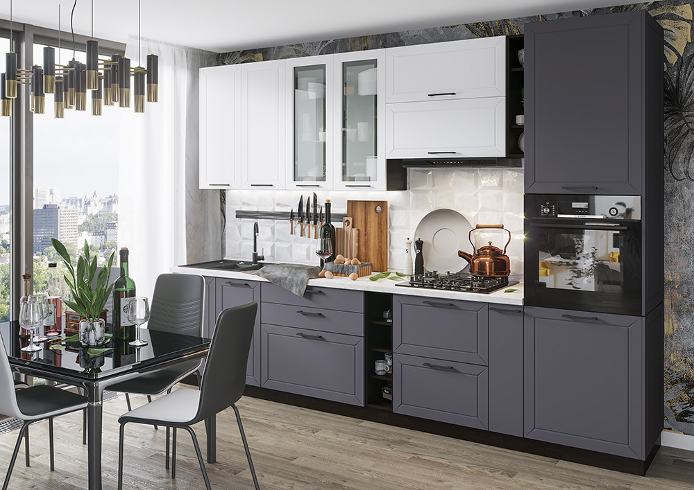 Комбинированные фасады из МДФ. Ширина кухни 160 см.