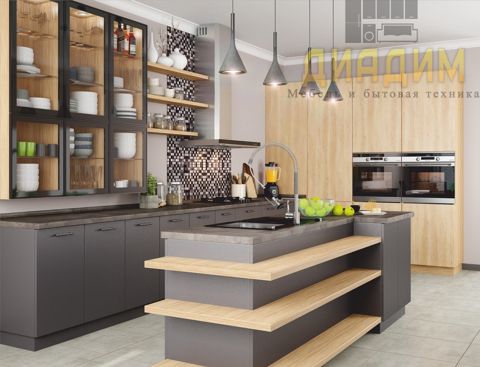 Фасады с филенкой и витражами. Подсветка. Функциональный остров с ящиками и шкафчиками.