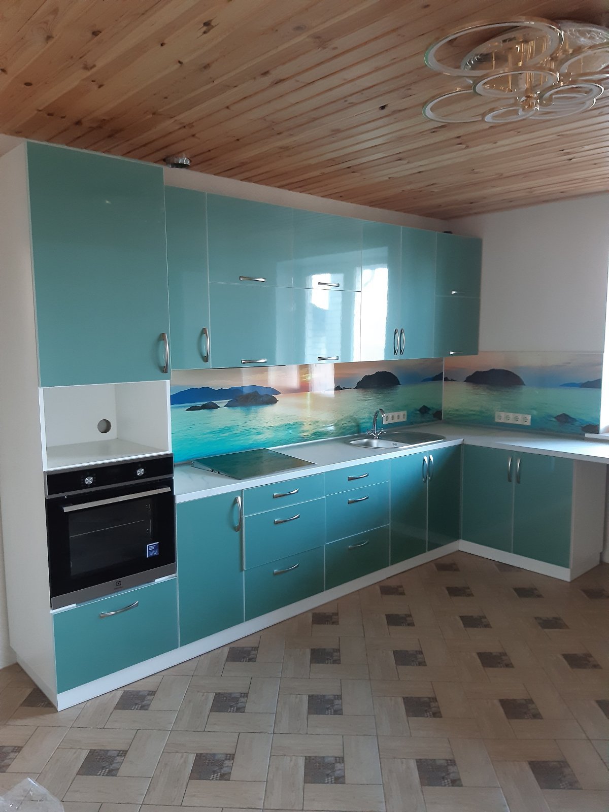 Лазурный тон фасадов и теплый древесный оттенок столешницы.