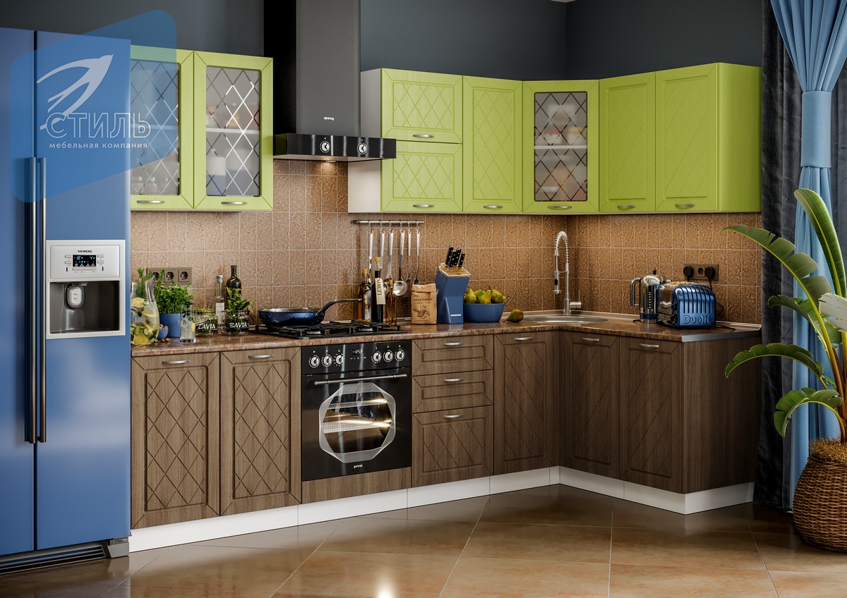 Цвет фасадов из крашеного МДФ: нижние – черный с зеленой аэрографией, верхние – зеленый.