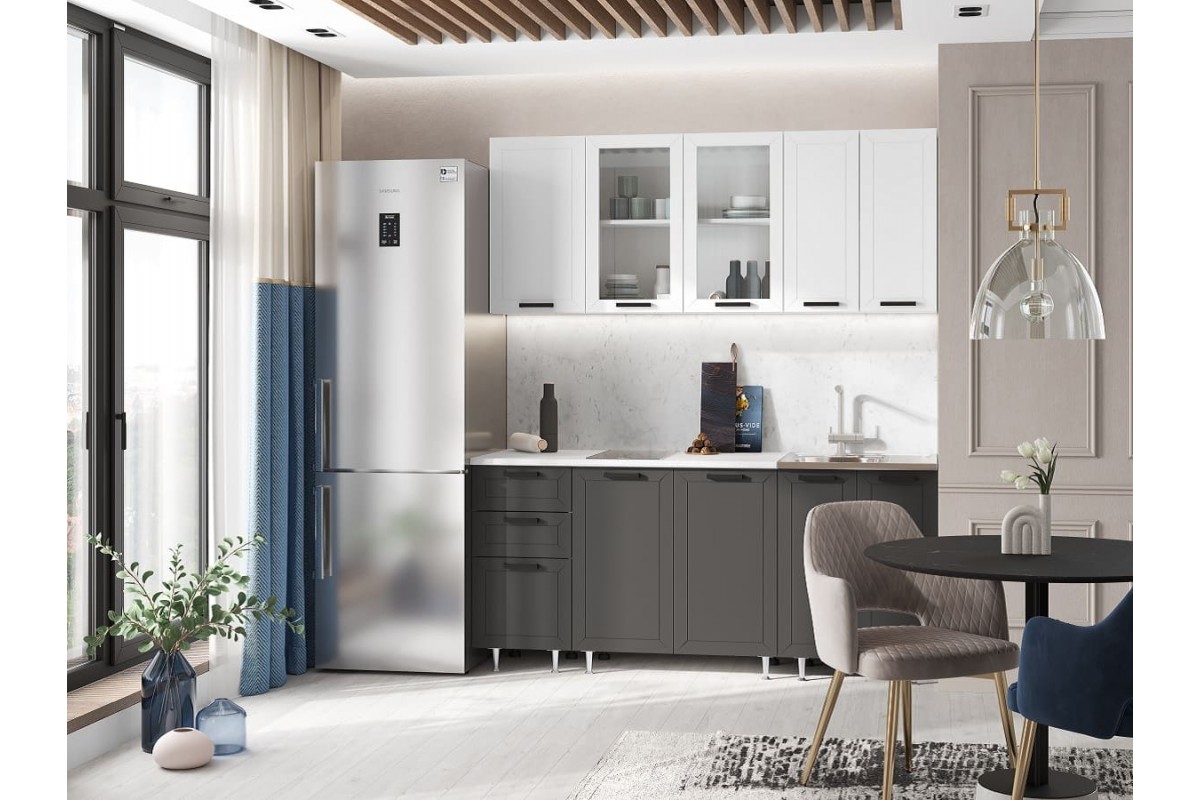 - Современный дизайн: Кухня выполнена в элегантном сочетании белых верхних фасадов и темных нижних, что придает интерьеру глубину и стиль.