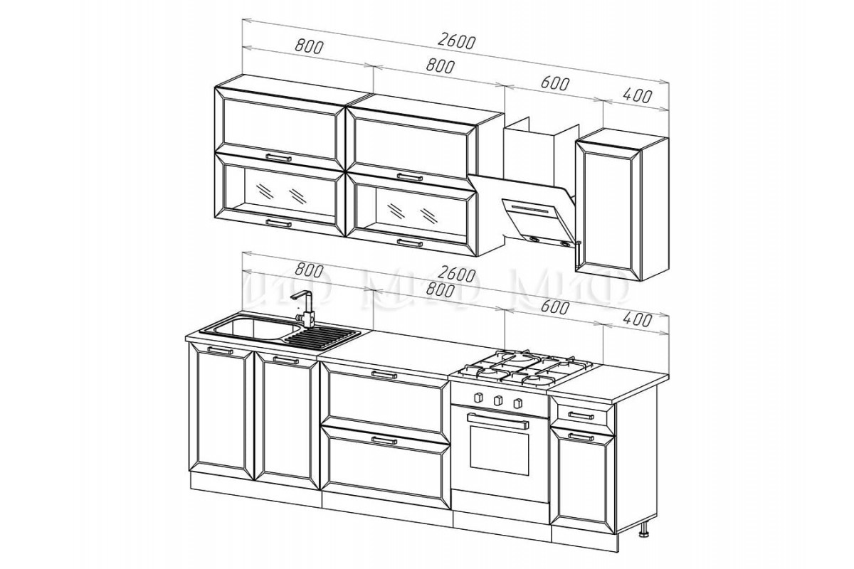 код 144384Ширина кухни: 2600 мм. Материал фасада: МДФ (Kronospan).