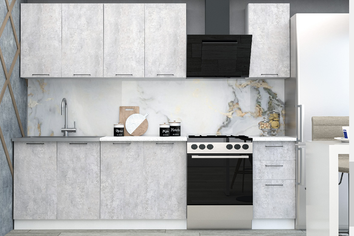 В наборе шесть модулей: сверху сушка 800 мм, шкафы 800 мм, 400 мм и снизу мойка 800 мм и столы 800 мм, 400мм с тремя ящиками.