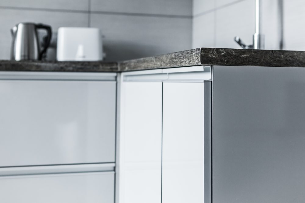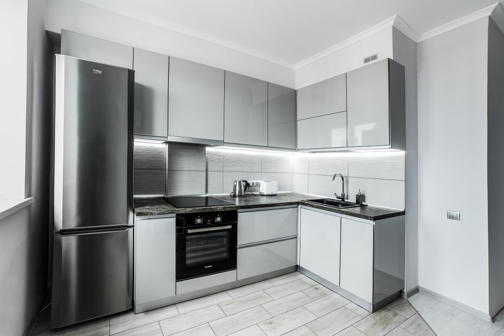Кухня длиной 160 см. Стильное сочетание цветов фасада.