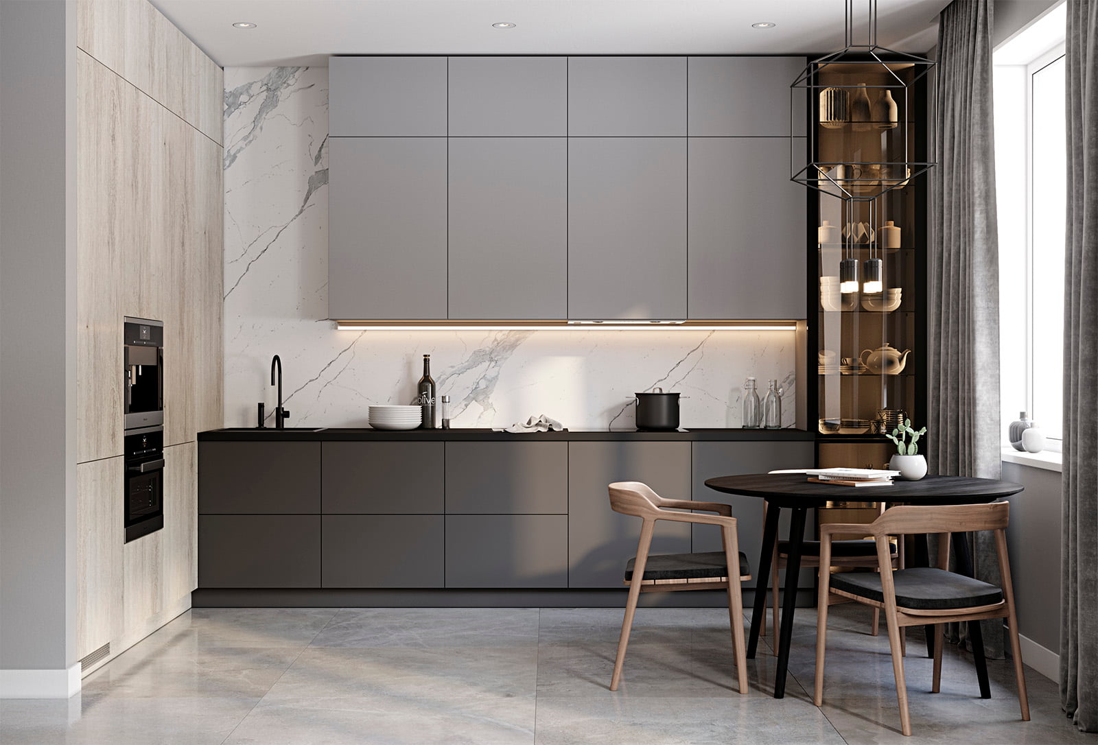 Фасады акрил fenix ntm, цвет серо-синий ntm (0724), cерый ntm (0752) / лдсп тимбер, цвет дуб песочно-серый столешница пластик hpl, 38 мм, цвет вулкано
