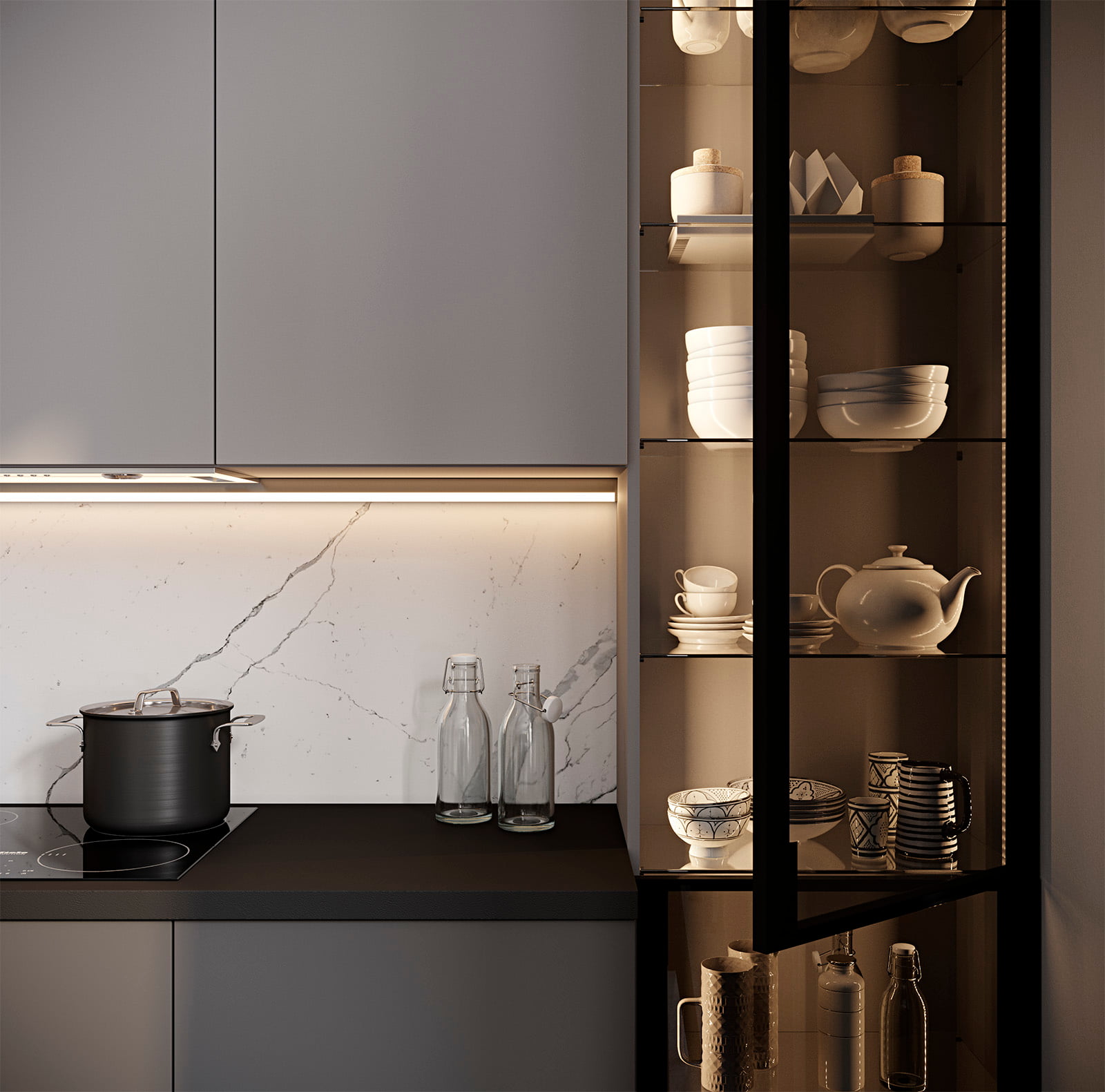 Фасады: пластик 3091gls с интегрированными ручками. Столешница: RESOPAL 4939-KS. Фурнитура: BLUM, BOYRD.