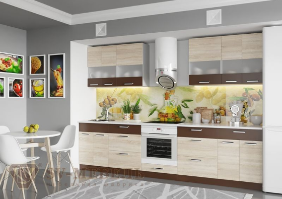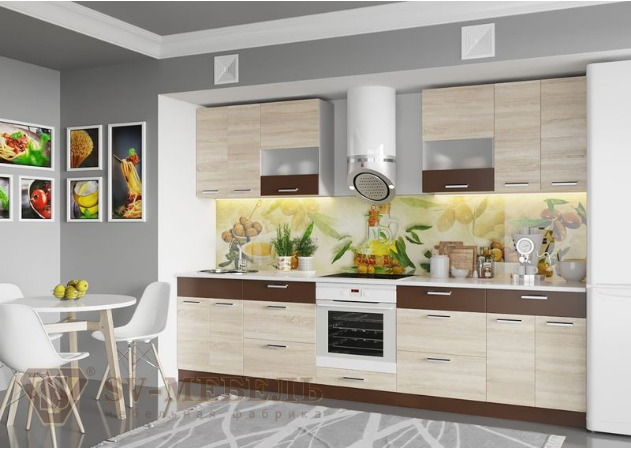 Кухня комплектуется корпусами из ламинированной ДСП «Серый». Фасады нижних модулей и стеклостворки верхних модулей комбинированные: ЛДСП «Дуб Сонома» - ЛДСП «Арабика», глухие фасады верхних модулей ЛДСП «Дуб Сонома».