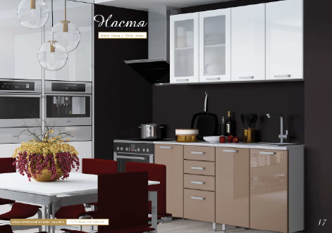 Цена указана за кухню шириной 1,6 метра, что на первом фото. В наборе пять модулей: шкаф верхний 800 мм, шкаф верхний стекло 800 мм, шкаф нижний 400 мм, шкаф нижний с ящиками 400 мм, шкаф нижний мойка 800 мм)