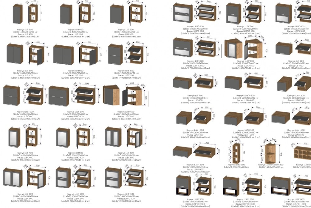 Представлены стандартные кухни шириной 1,6/2,0/2,5/2,6 метра. Также можно заказать кухню с другими наборами модулей.