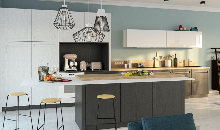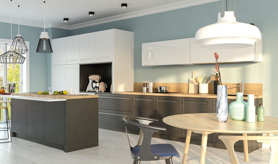 Островная кухня в скандинавском стиле с белыми матовыми фасадами с интегрированными ручками.