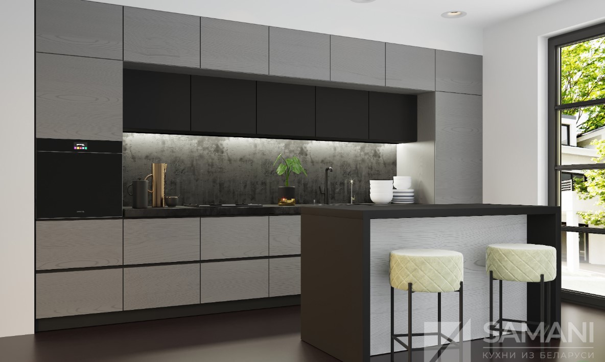 Темные и светлые фасады из пленочной МДФ. Ширина кухни 200 см.