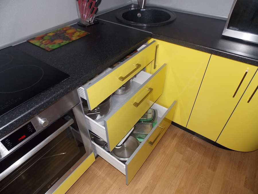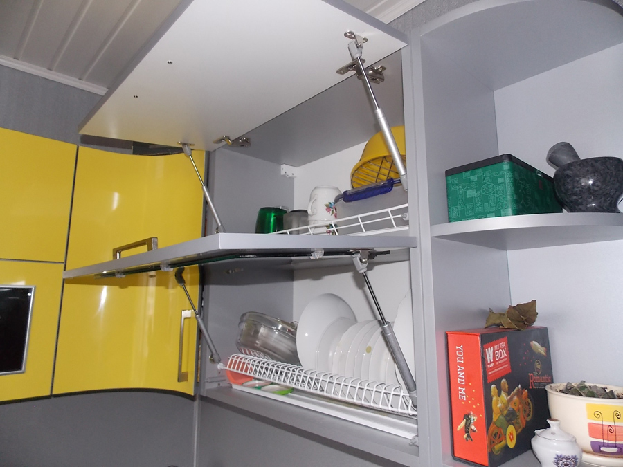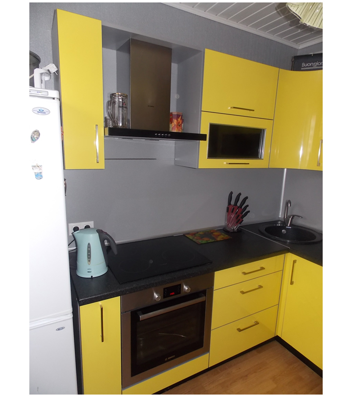 Кухня характеризуется небольшими размерами, отличается приятным дизайном. Фасады гарнитура окрашены в желтый цвет и подарят вам яркое солнечное настроение. Часть фасадов декорирована вставками тонированного стекла.