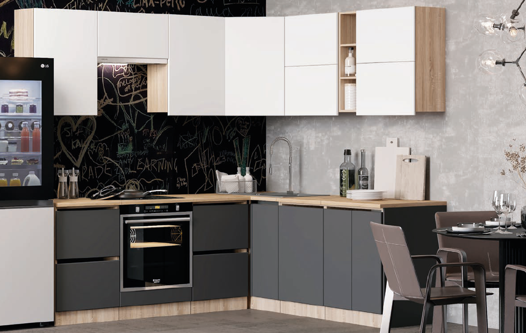 Универсальный светло-серый цвет фасадов в тандеме с древесным оттенком столешницы.