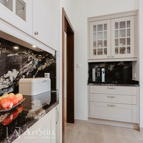Столешница выполнена из искусственного кварца фирмы Vicostone. Этот материал отличается высокой прочностью и устойчивостью к повреждениям, что делает его идеальным выбором для кухни.