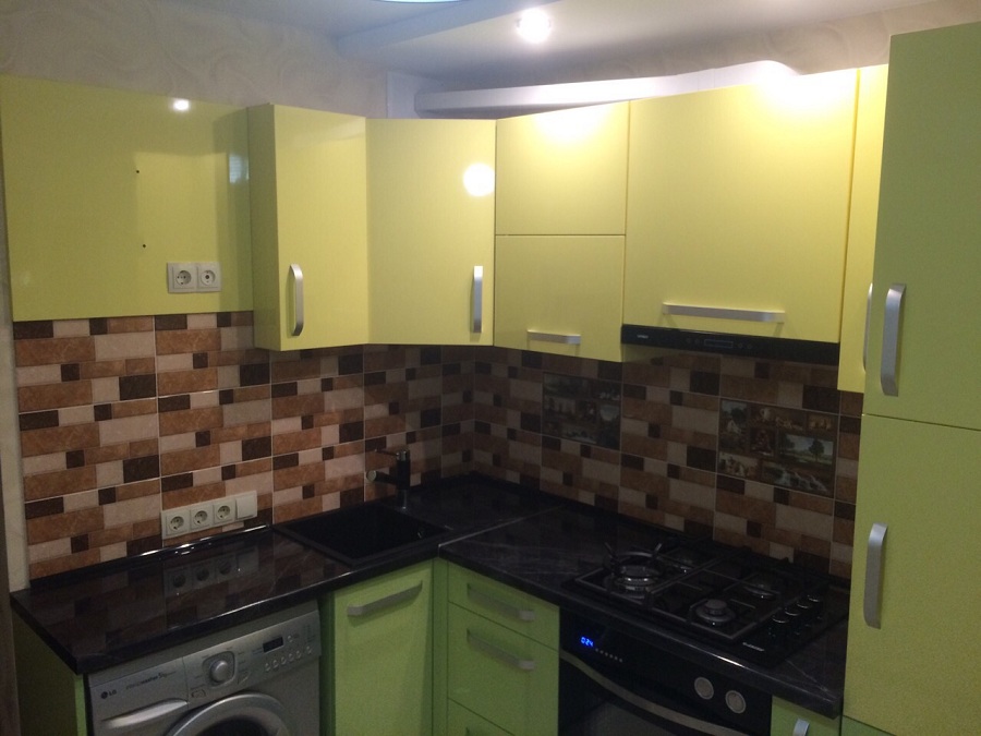 Скинали кухни выполнены из керамической плитки. Низ в салатовом глянце.