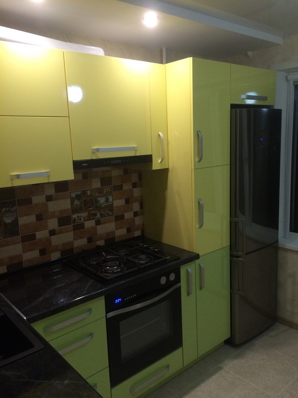 Угловой гарнитур с нишей для холодильника. Фасады: глянец. Черная столешница под камень.