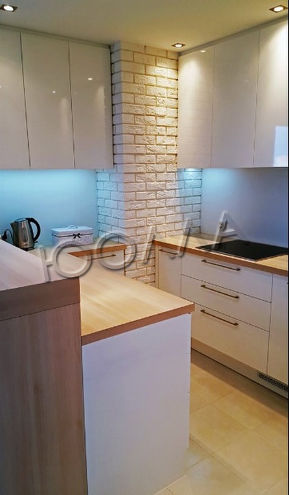 код 89666Белые фасады, столешница имитирует дерево, делает интерьер домашним и уютным.