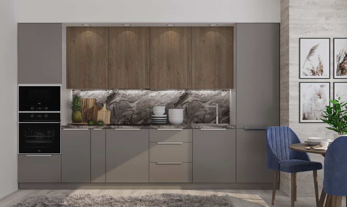 Лаконичные ручки-рейлинги и столешница с древесной текстурой.