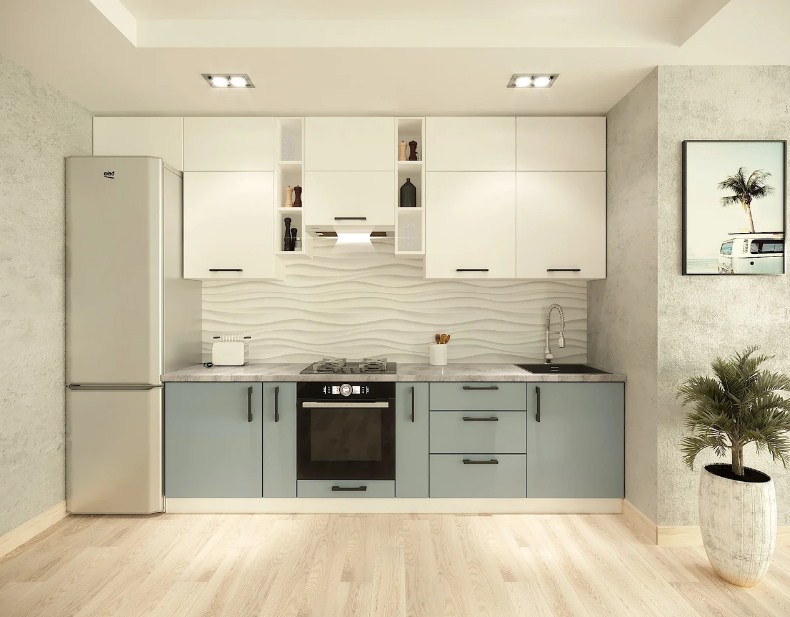 Размеры и конфигурация кухни могут быть любые: линейная, угловая, 2-х или 3-х ярусная, с применением Gola-профиля, с пеналами и т.п.