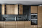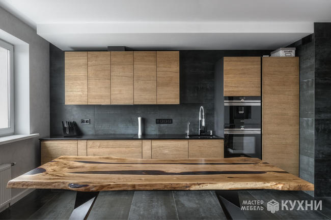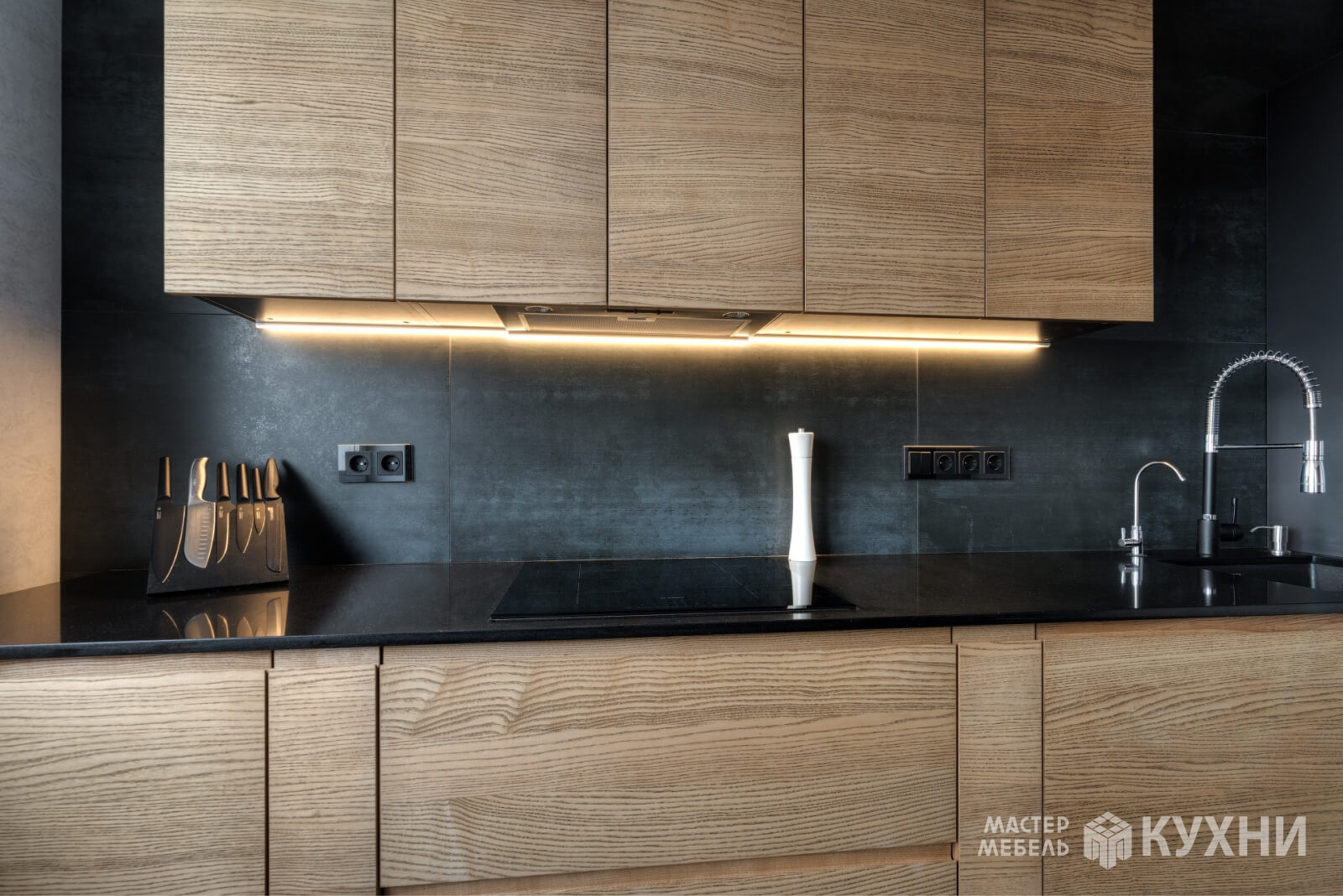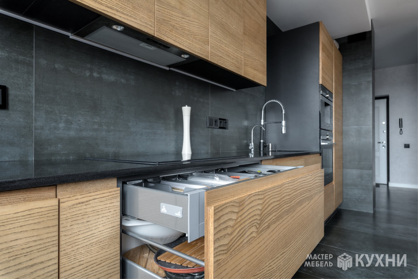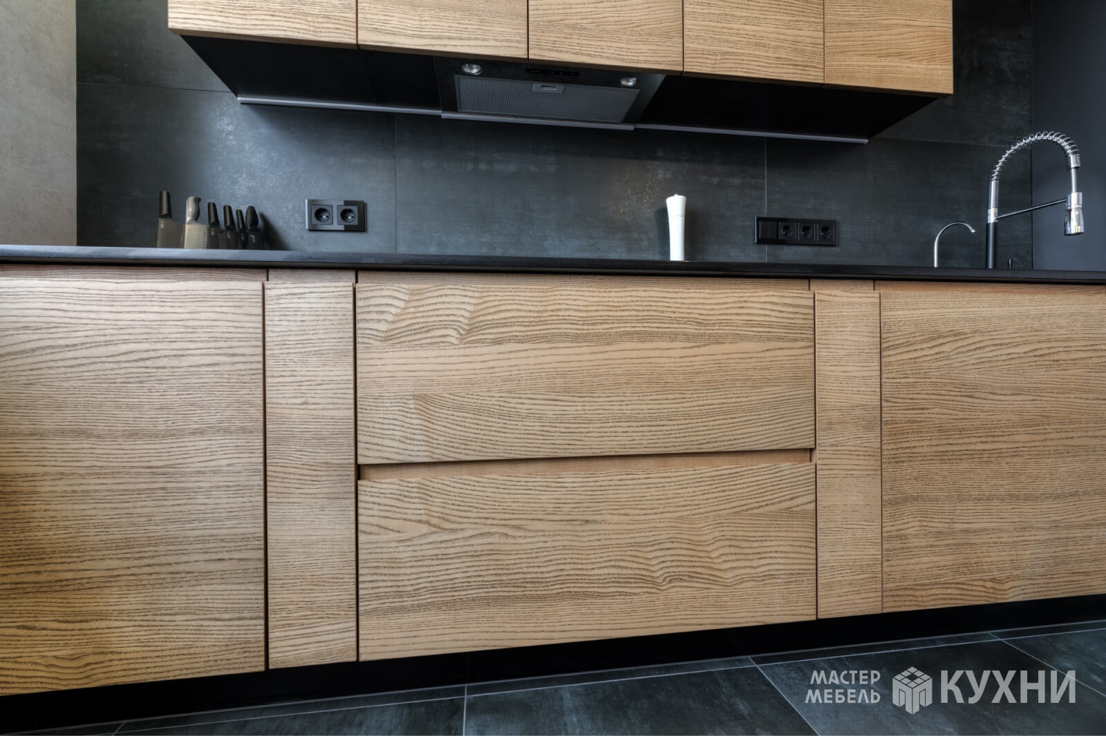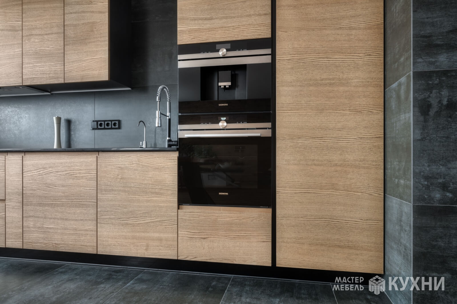 Интегрированные ручки, надежная фурнитура, ниши для встраиваемой техники, матовые фасады.