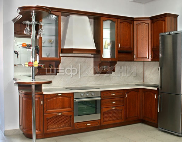 Кухня из массива фабрики «Геос идеал». Классический стиль, элегантные витражи, двери-решетки, резные элементы отделки в сочетании с широкой гаммой итальянских ручек с керамической понравится любому члену семьи.