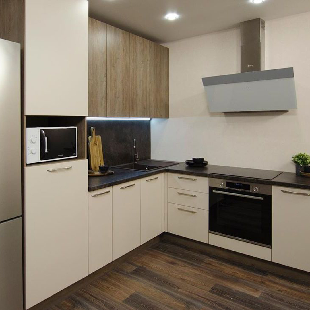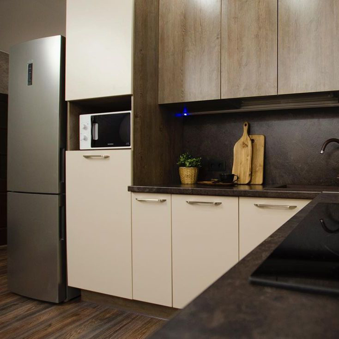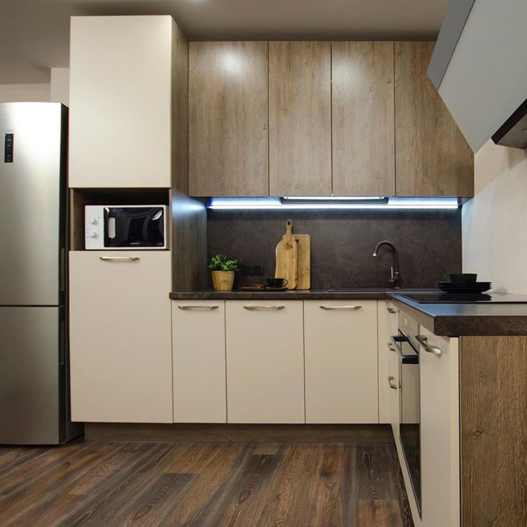 Оригинальная расцветка фасадов в натуральный тонах. Материал – ламинированная ДСП.