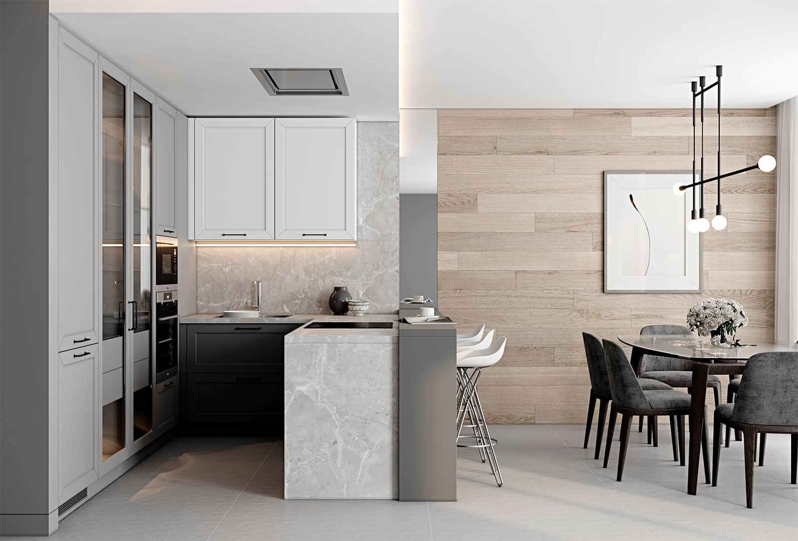 Белые фасады, черная столешница и фурнитура, открытые ниши.