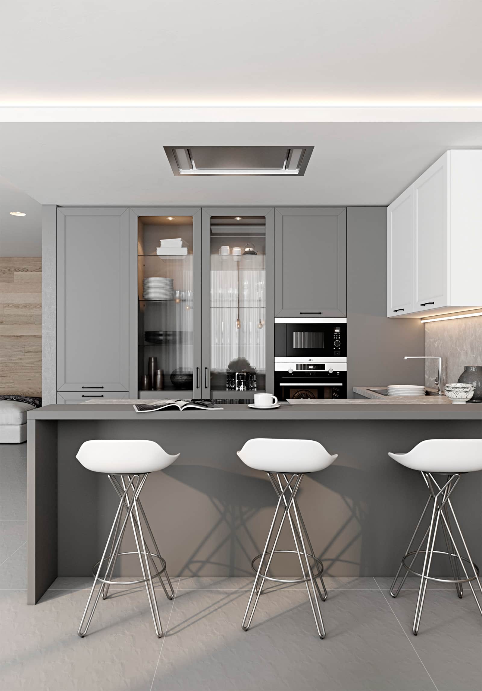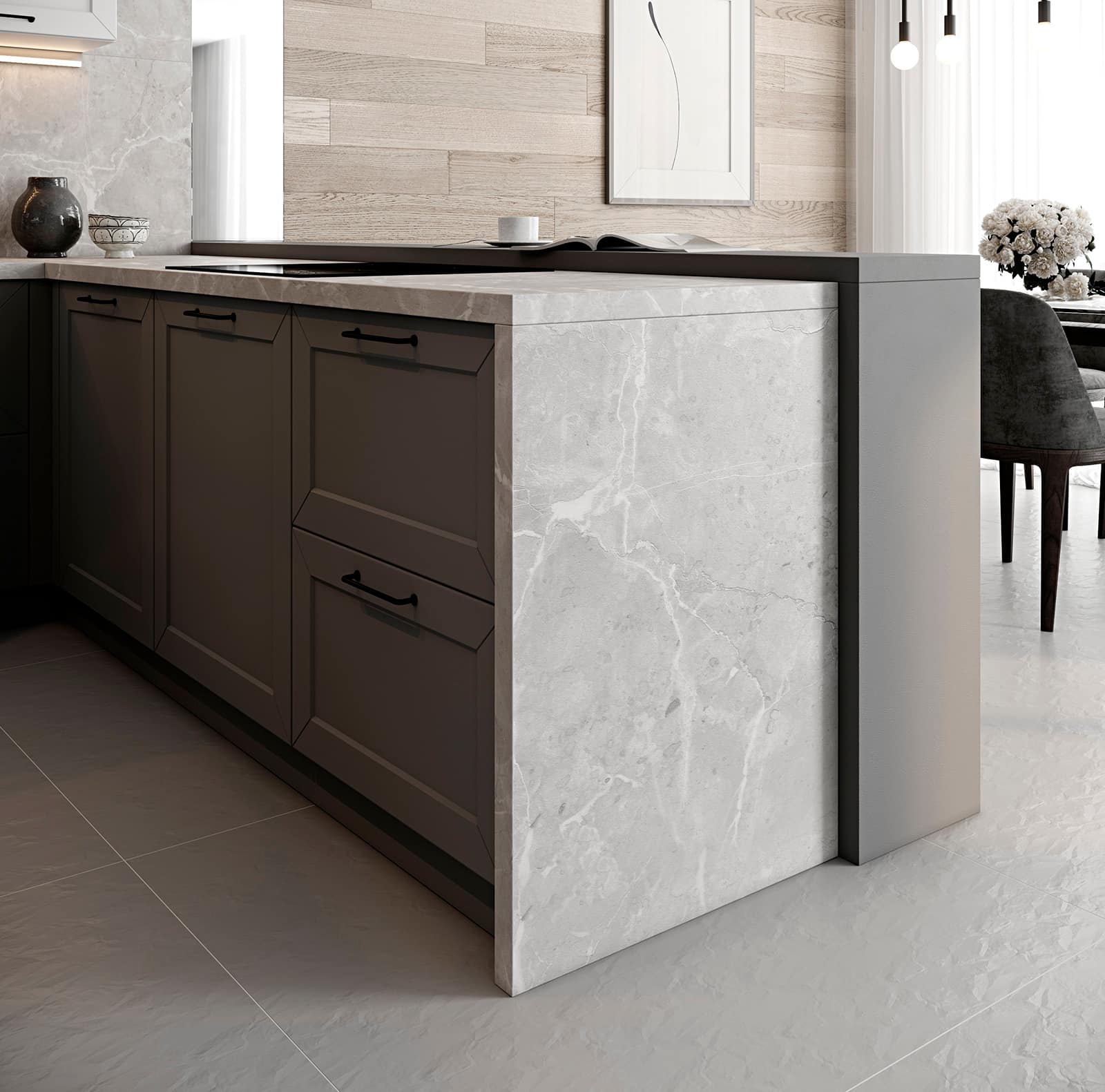 Фасады ньюарк (мдф / пвх), цвет ral 7037 dusty grey матовый / ral 9003 signal white матовый столешница пластик hpl, 38 мм, цвет мрамор вальмасино светло-серый / ченери