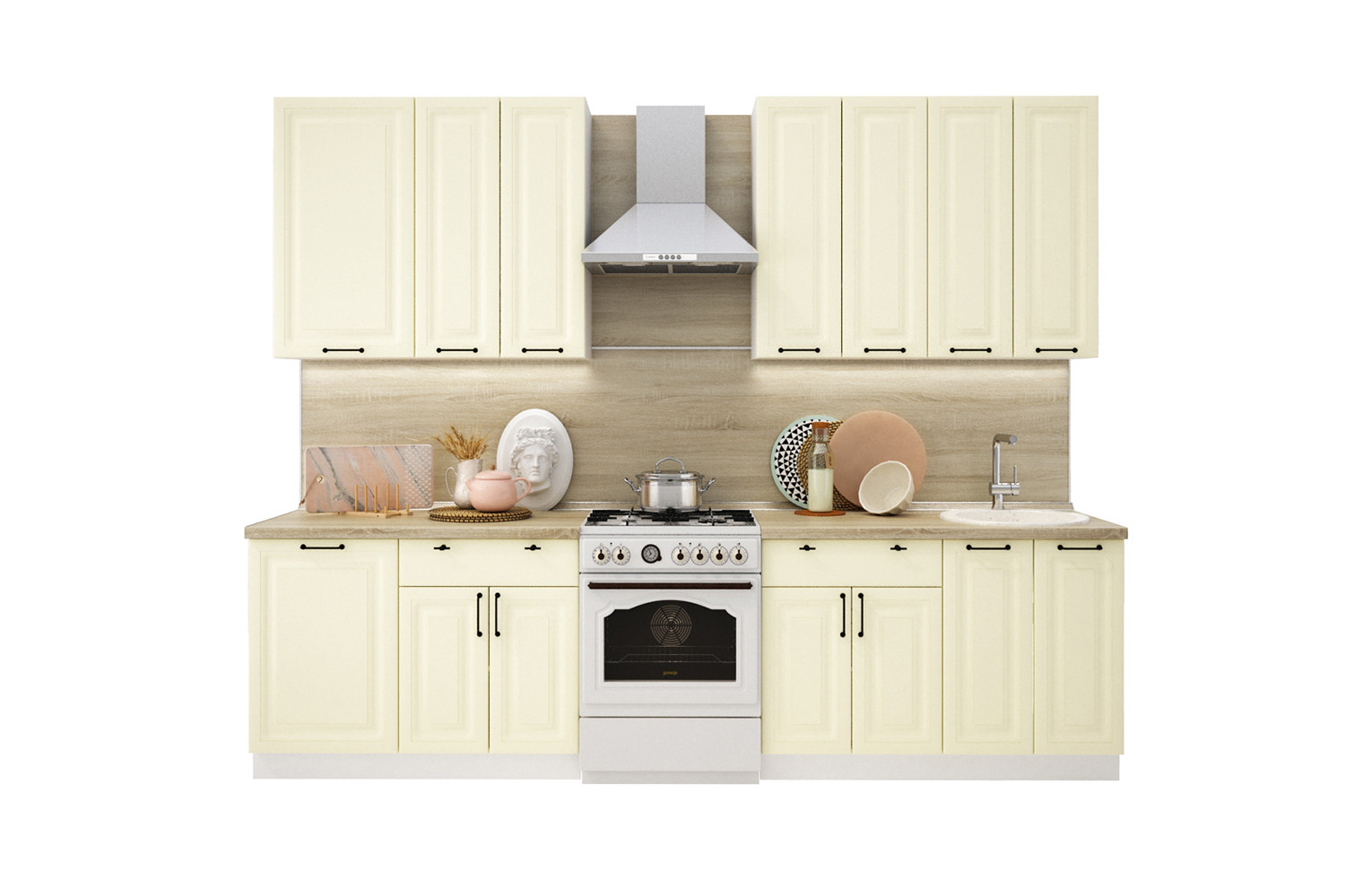 Верхние фасады со стеклом. Ширина кухни 250 см.