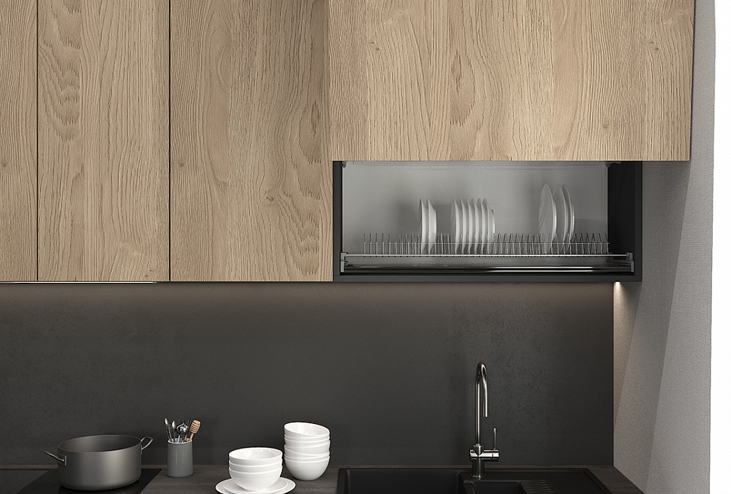 Минималистичная кухня от фабрики ЗОВ с комбинированными фасадами из шпона и пластика.
